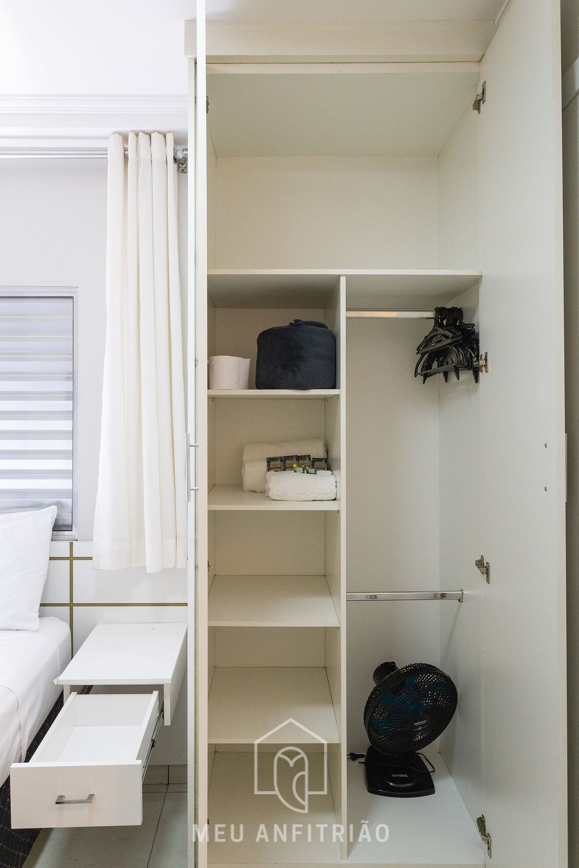 We also provide a Smart TV, wardrobe, counter with chairs for dining or home office, curtains, and a bathroom with a gas shower.