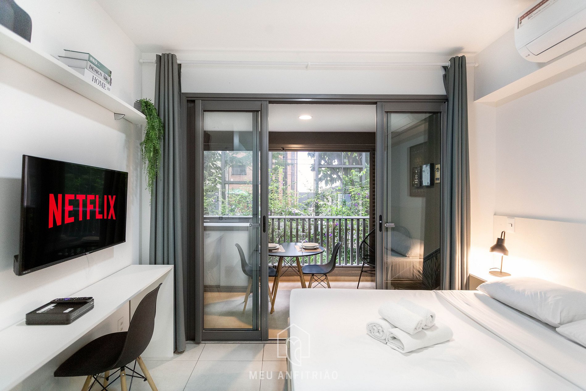 For a more cozy environment, we have blackout curtains dividing the bedroom from the balcony.