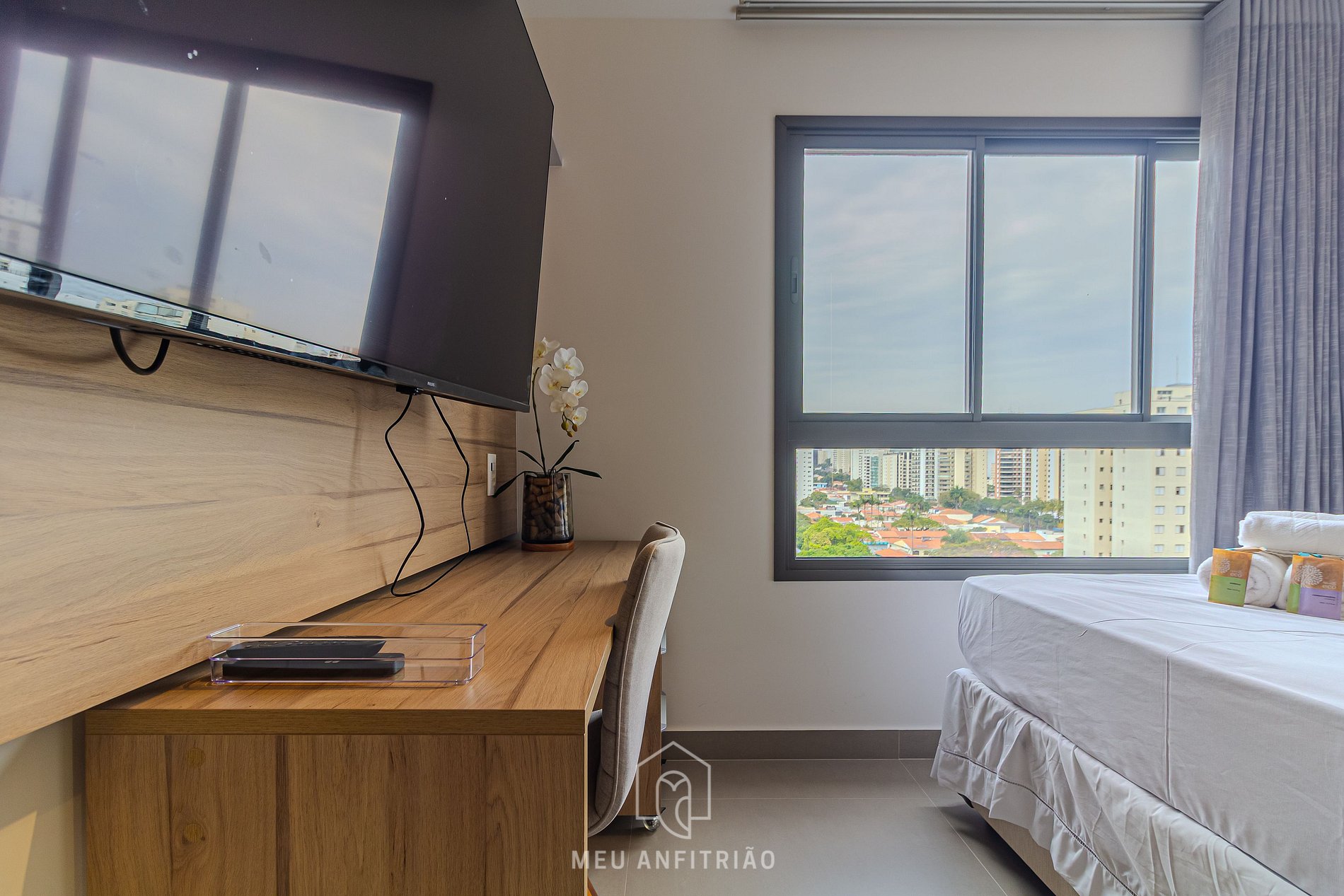 Next, there's a sofa, a Smart TV with cable channels, a desk and chair for a home office, and glass windows with blackout curtains.