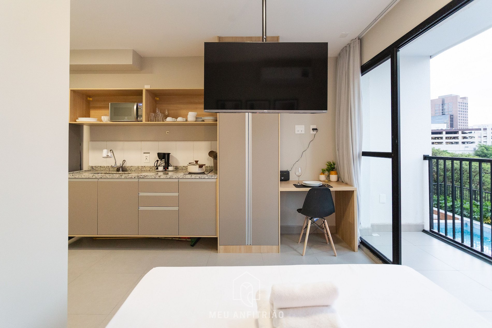 A acomodação é ótima, bonita e corresponde exatamente às imagens. Estava tudo limpo e organizado. A cozinha é bem completa, com todos os utensílios para preparar refeições básicas. A varanda com vista para a piscina deixa o espaço ainda mais agradável.