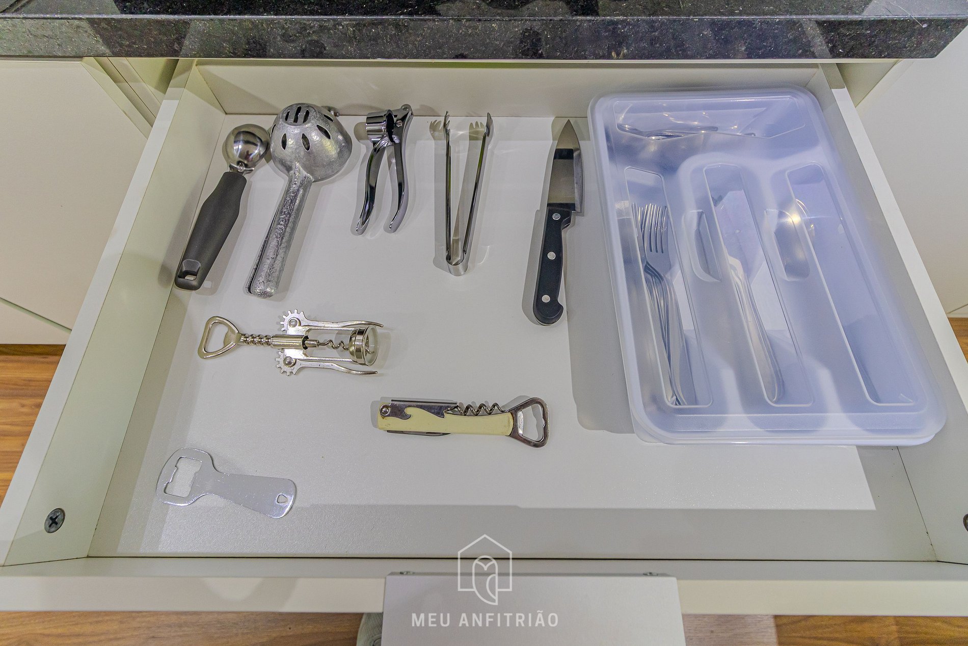 Upon entering, guests will be taken directly to the kitchen, which features the ideal appliances for a convenient stay, such as a refrigerator, electric cooker, air fryer, microwave, electric kettle, water filter, Três Corações coffee maker, and more.