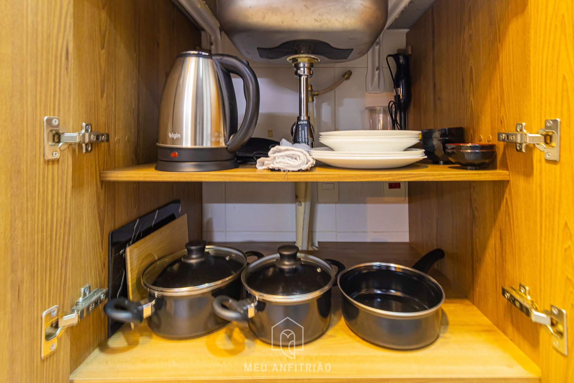 Entrando, o hóspede estará na cozinha, que conta com frigobar, fogão cooktop, microondas, sanduicheira, liquidificador, chaleira elétrica, cafeteira Nespresso Essenza Mini entre outros. A varanda divide os espaços entre os ambientes através de uma porta de vidro com isolamento acústico, cortinas blackout, mesa com cadeiras para refeições e vista para a cidade.