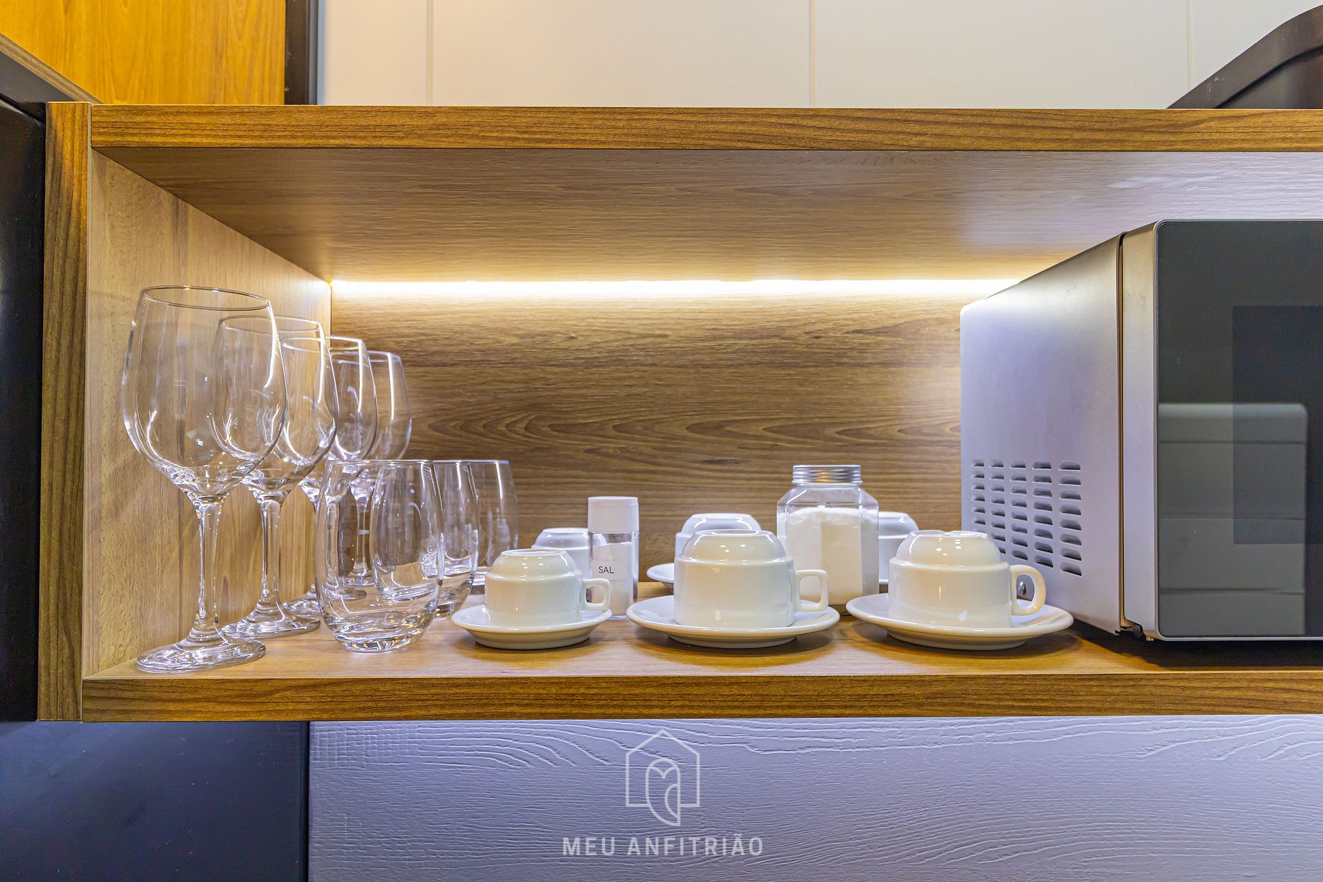 Entrando, o hóspede estará na cozinha, que conta com frigobar, fogão cooktop, microondas, sanduicheira, liquidificador, chaleira elétrica, cafeteira Nespresso Essenza Mini entre outros. A varanda divide os espaços entre os ambientes através de uma porta de vidro com isolamento acústico, cortinas blackout, mesa com cadeiras para refeições e vista para a cidade.