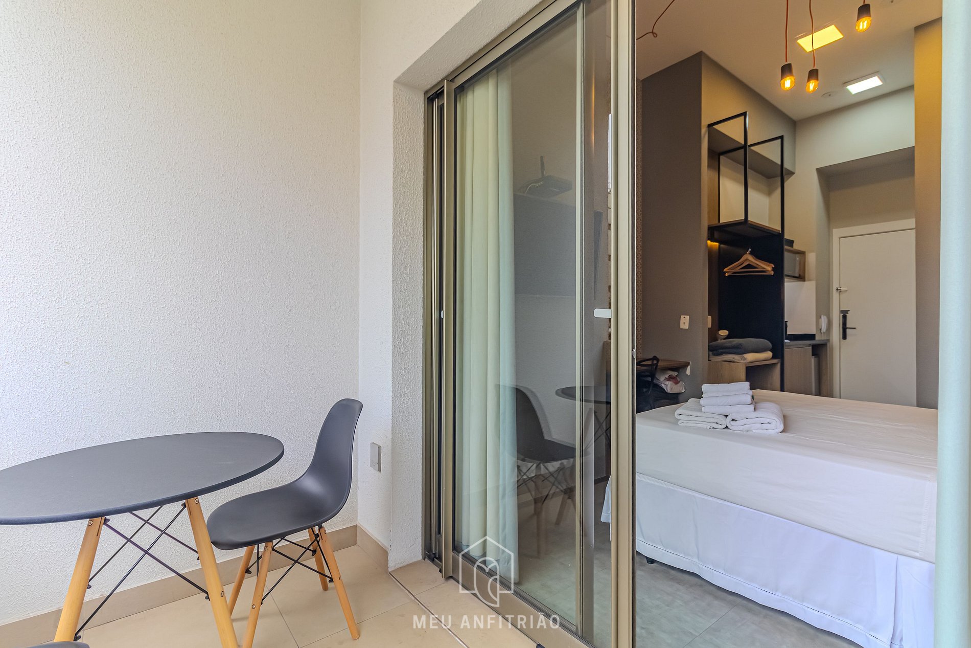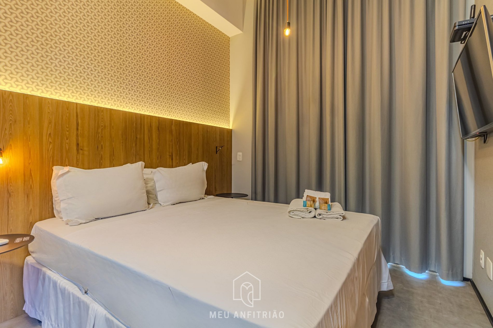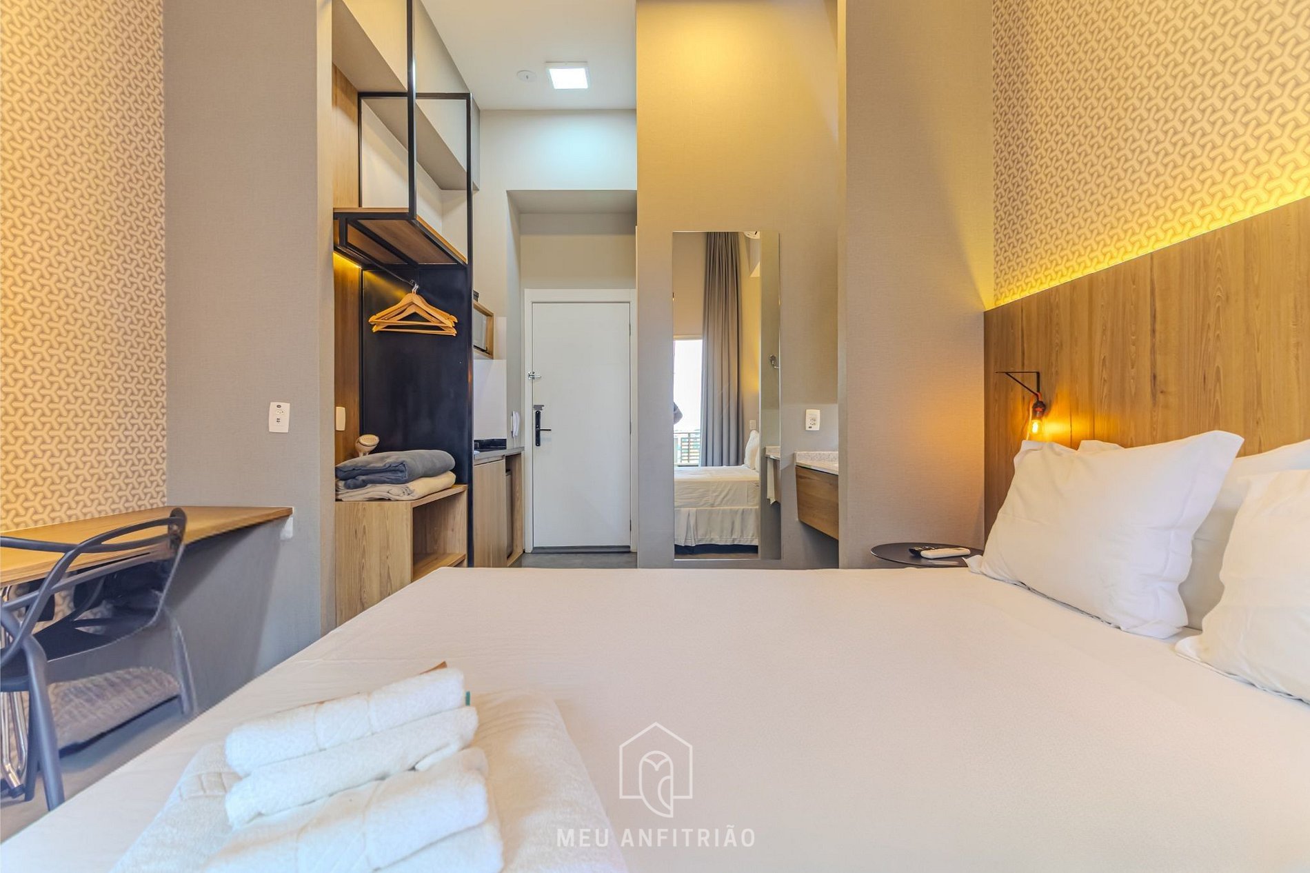 Nosso studio oferece um espaço de 26m² e acomoda até 2 pessoas em uma cama de casal. O condomínio possui área de lazer e portaria remota 24h.