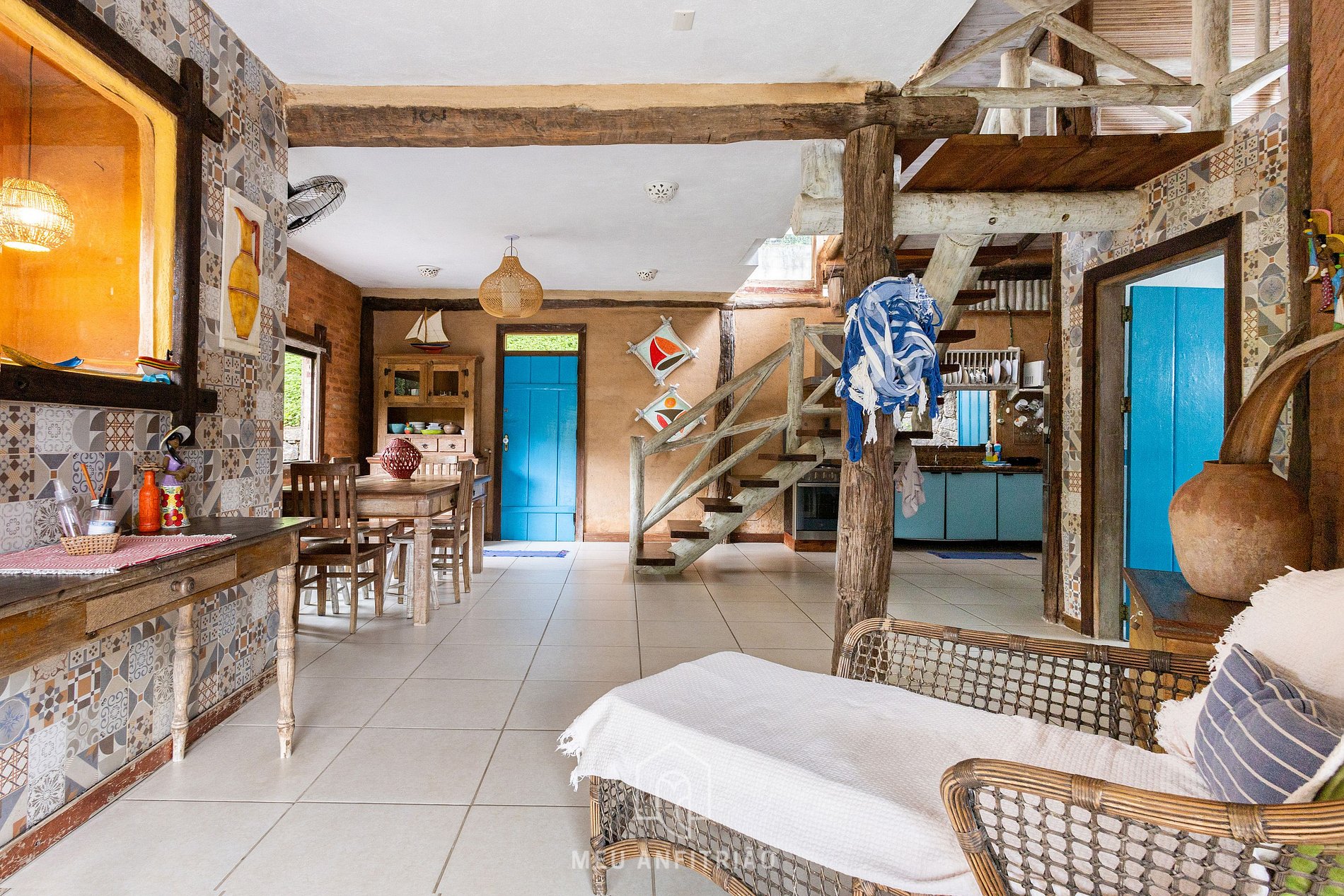 Al entrar a la casa, los huéspedes encontrarán la sala de estar, amueblada con cómodos sillones y un pequeño balcón con vistas a la naturaleza. Junto a ella, se encuentra el comedor, con mesa, sillas, un mueble auxiliar y ventilador.