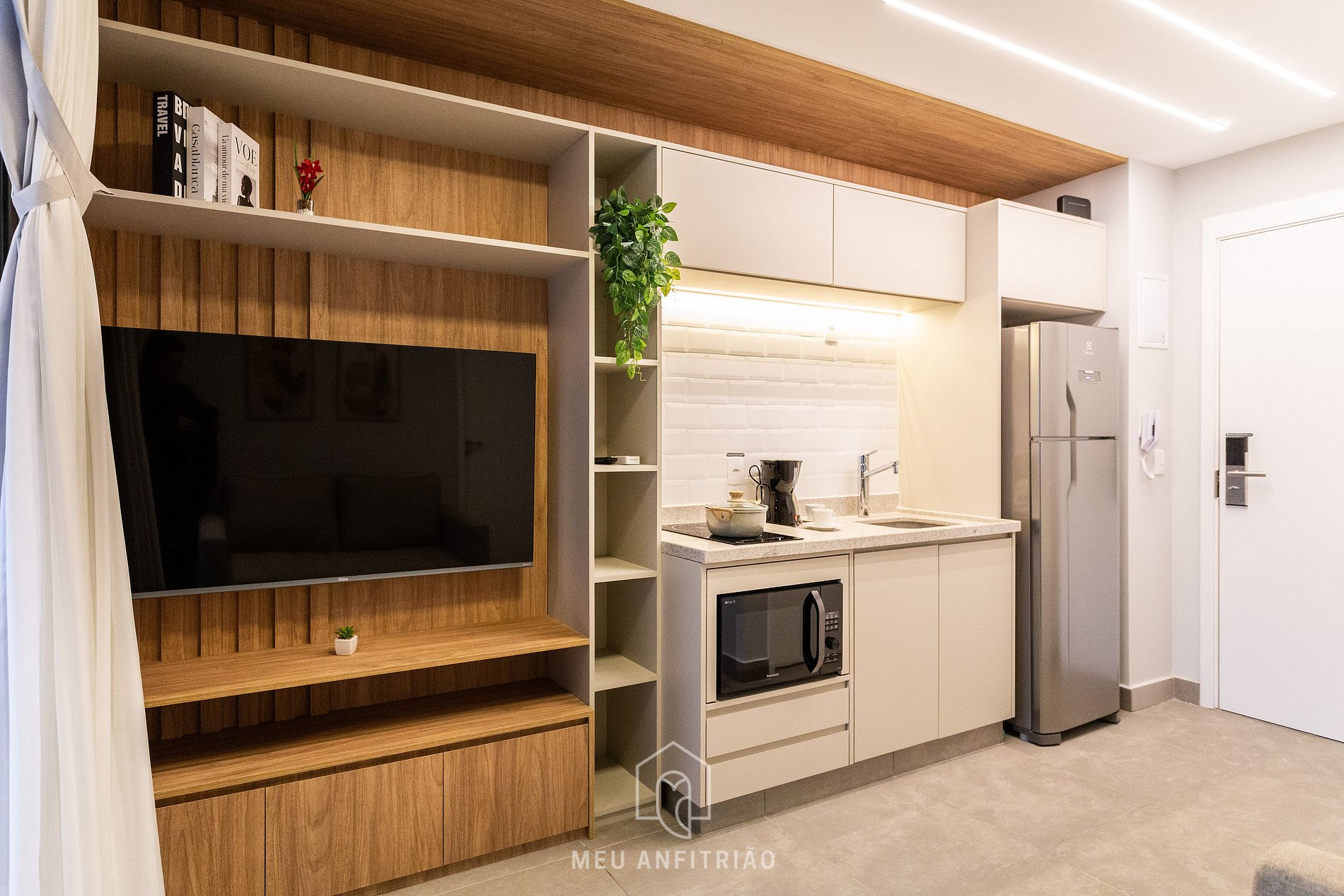 - Cozinha equipada com os principais utensílios para uma estadia prática, como fogão cooktop, geladeira, micro-ondas com função de forno, liquidificador, cafeteira e chaleira elétricas entre outros, além de um lavabo logo ao lado.