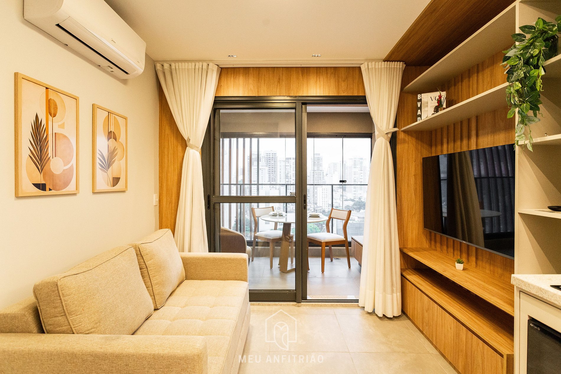 - Sala de estar com sofá-cama de casal, TV Smart Philco e ar-condicionado quente e frio.