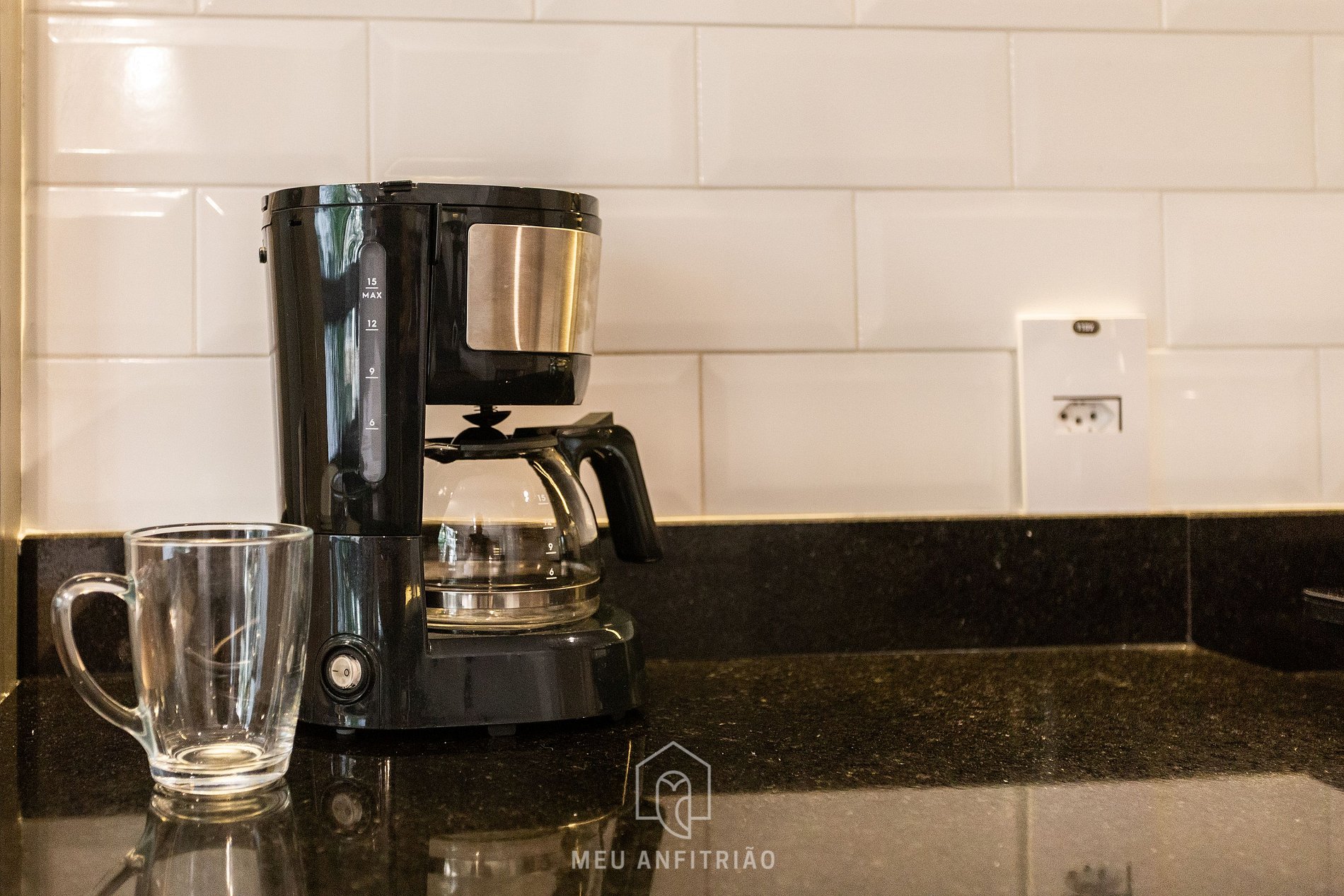 - A cozinha acompanha geladeira, filtro d’água, fogão cooktop 1 boca portátil, micro-ondas, liquidificador, chaleira e cafeteira elétricas, sanduicheira entre outros utensílios para uma estadia prática.