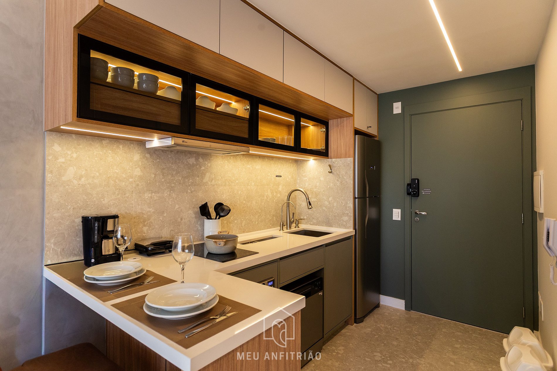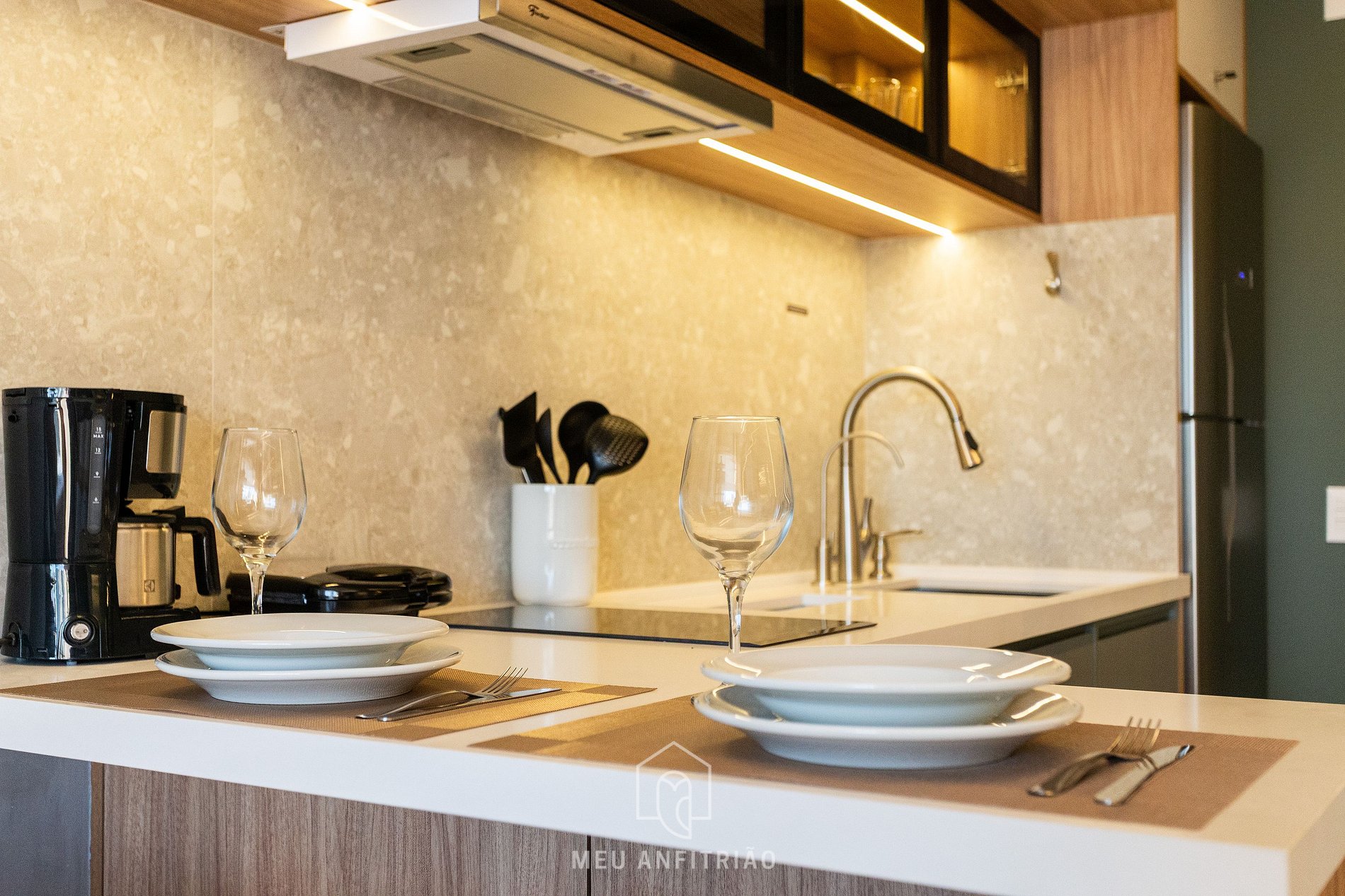 - Cozinha com geladeira, filtro d’água junto a pia, fogão cooktop 2 bocas, micro-ondas, lava-louças, cafeteira e chaleira elétricas, liquidificador, sanduicheria, mesa com cadeiras para refeições e mais utensílios para tornar a estadia prática e agradável.