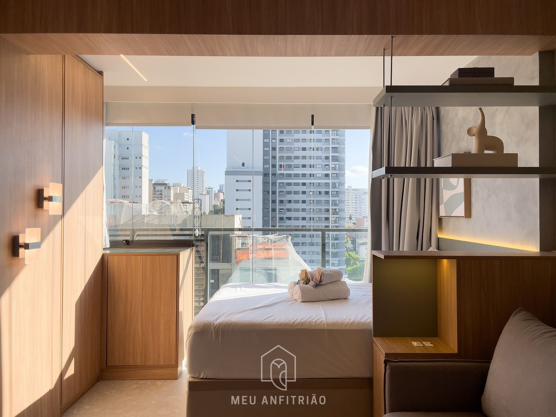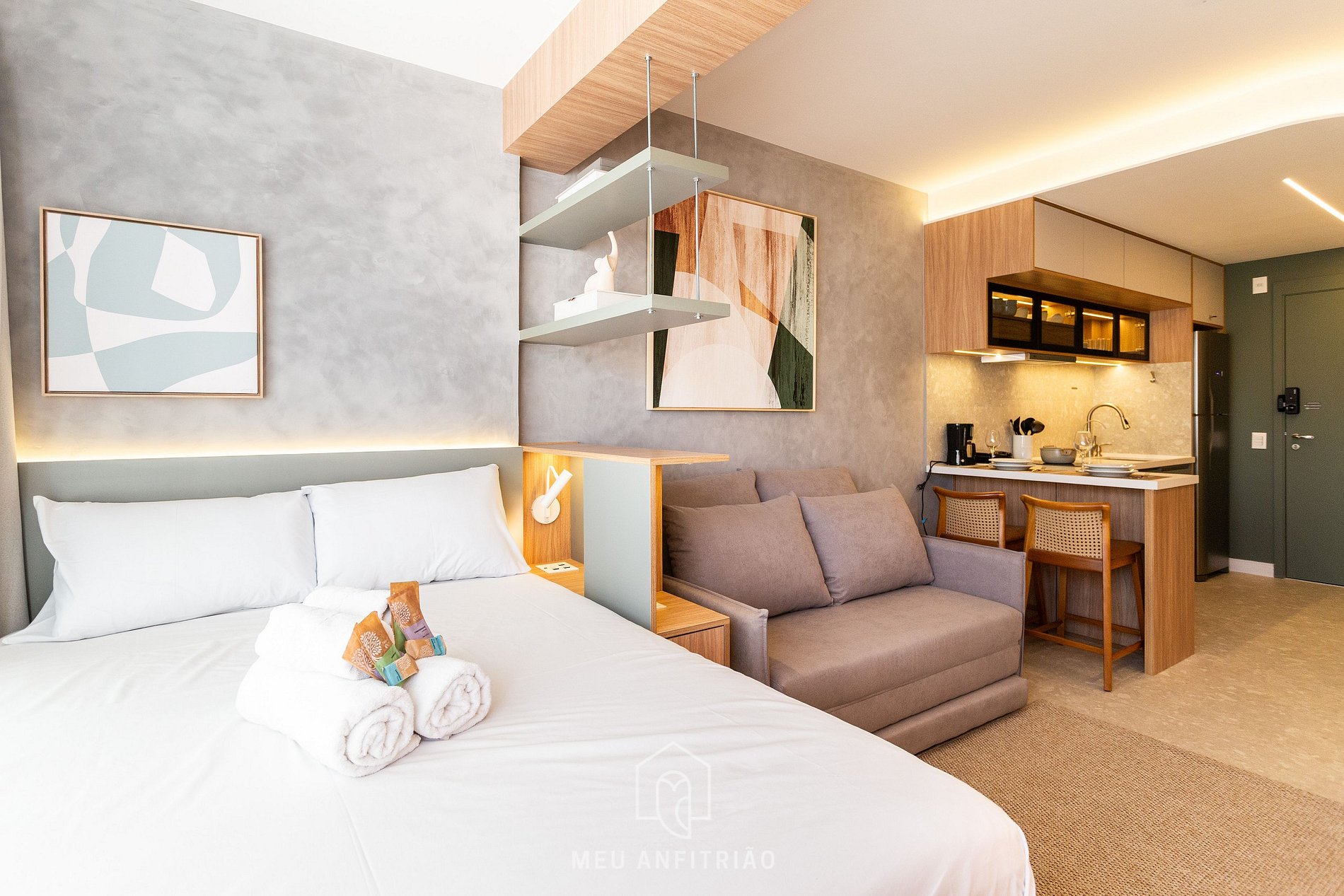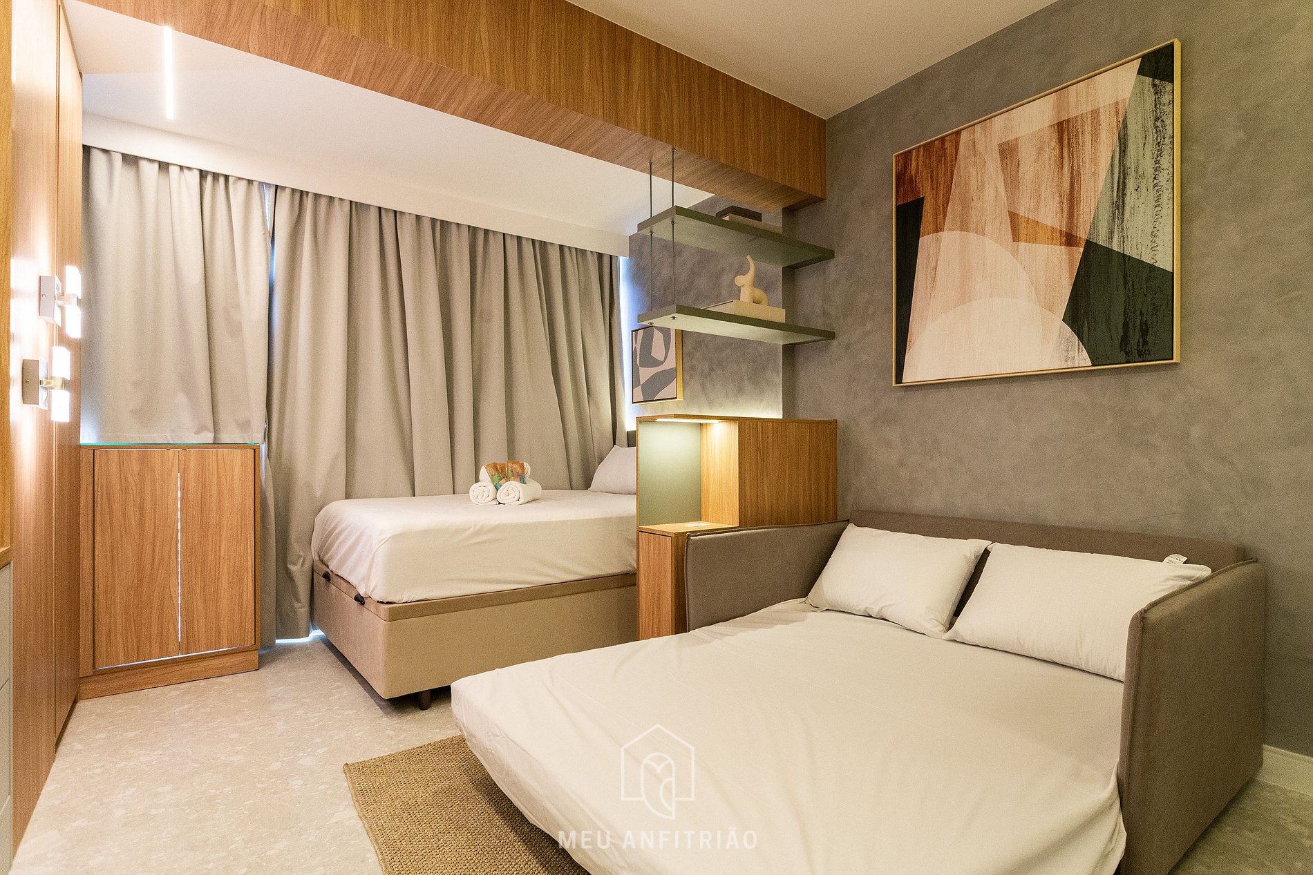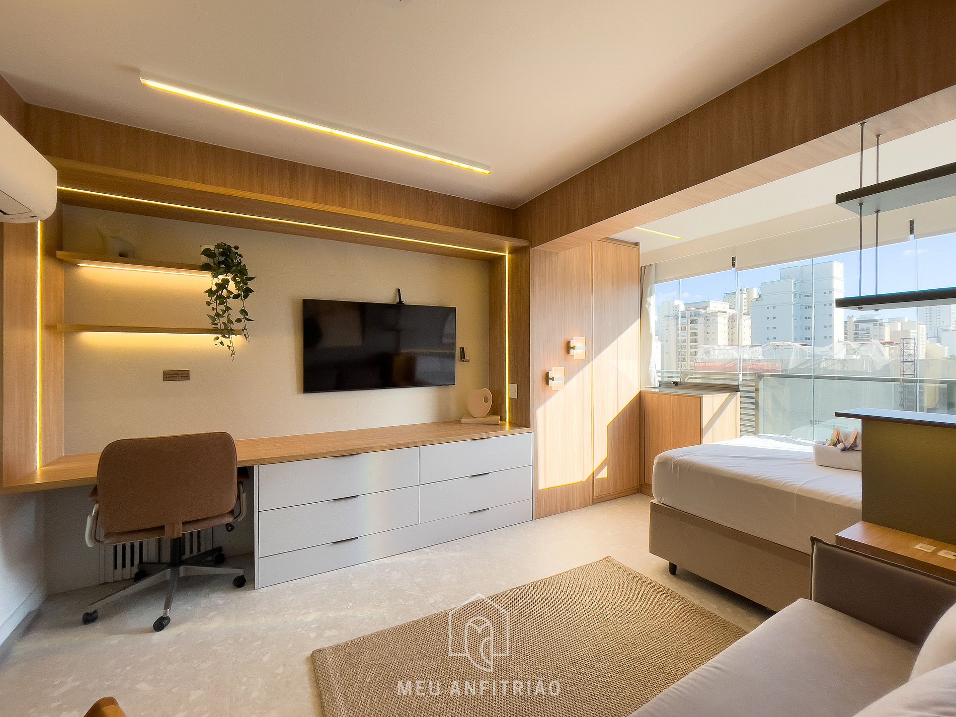 - O studio oferece sofá-cama para 2 pessoas, ar-condicionado quente e frio, Smart TV Samsung, armário, steamer, e na área da varanda integrada temos persianas, cama de casal e costinas blackout.
