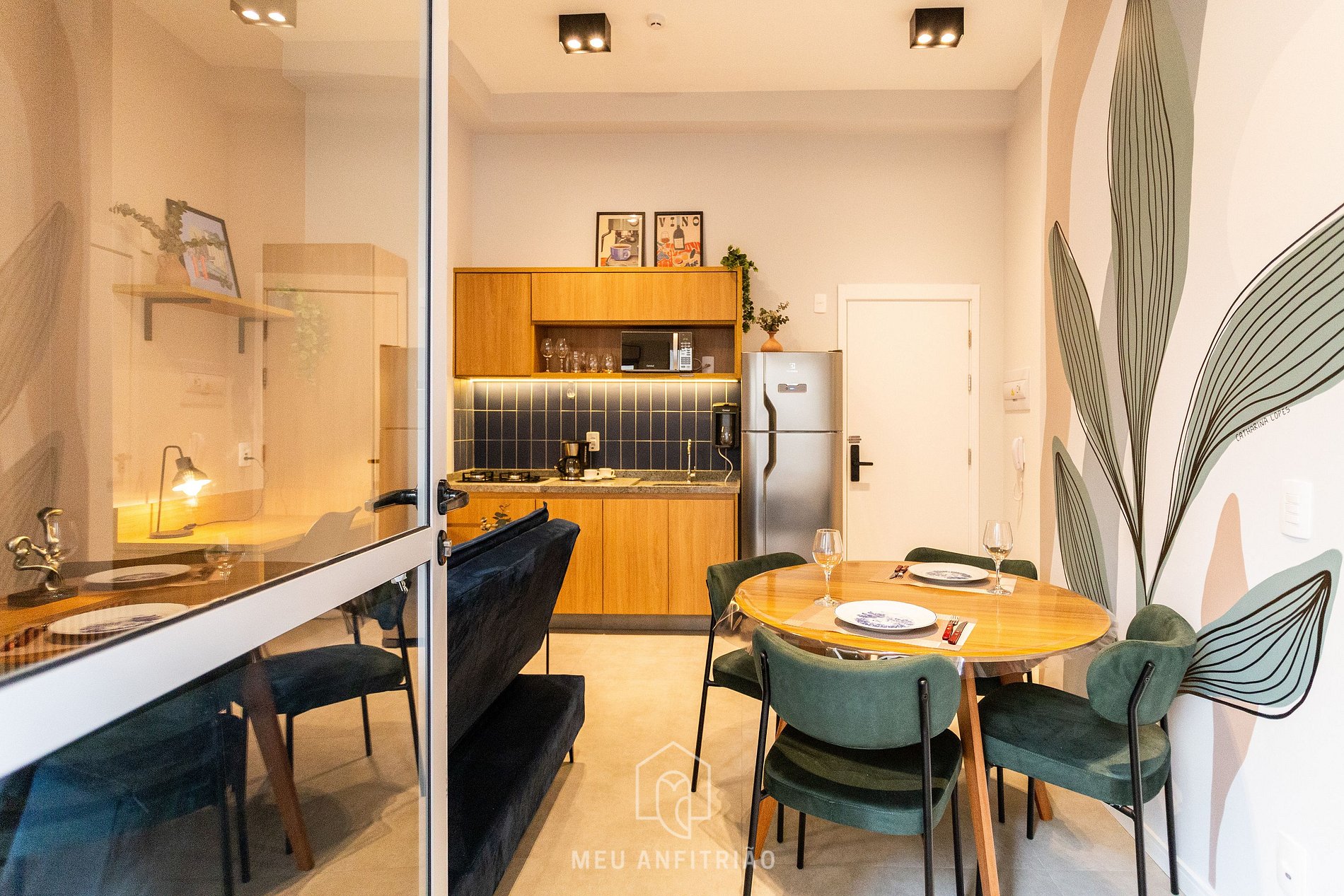 - Cozinha com os utensílios necessários para uma estadia prática, como geladeira, fogão cooktop, micro-ondas, cafeteira e chaleira elétricas, filtro d’água, air fryer, sanduicheira, liquidificador entre outros.