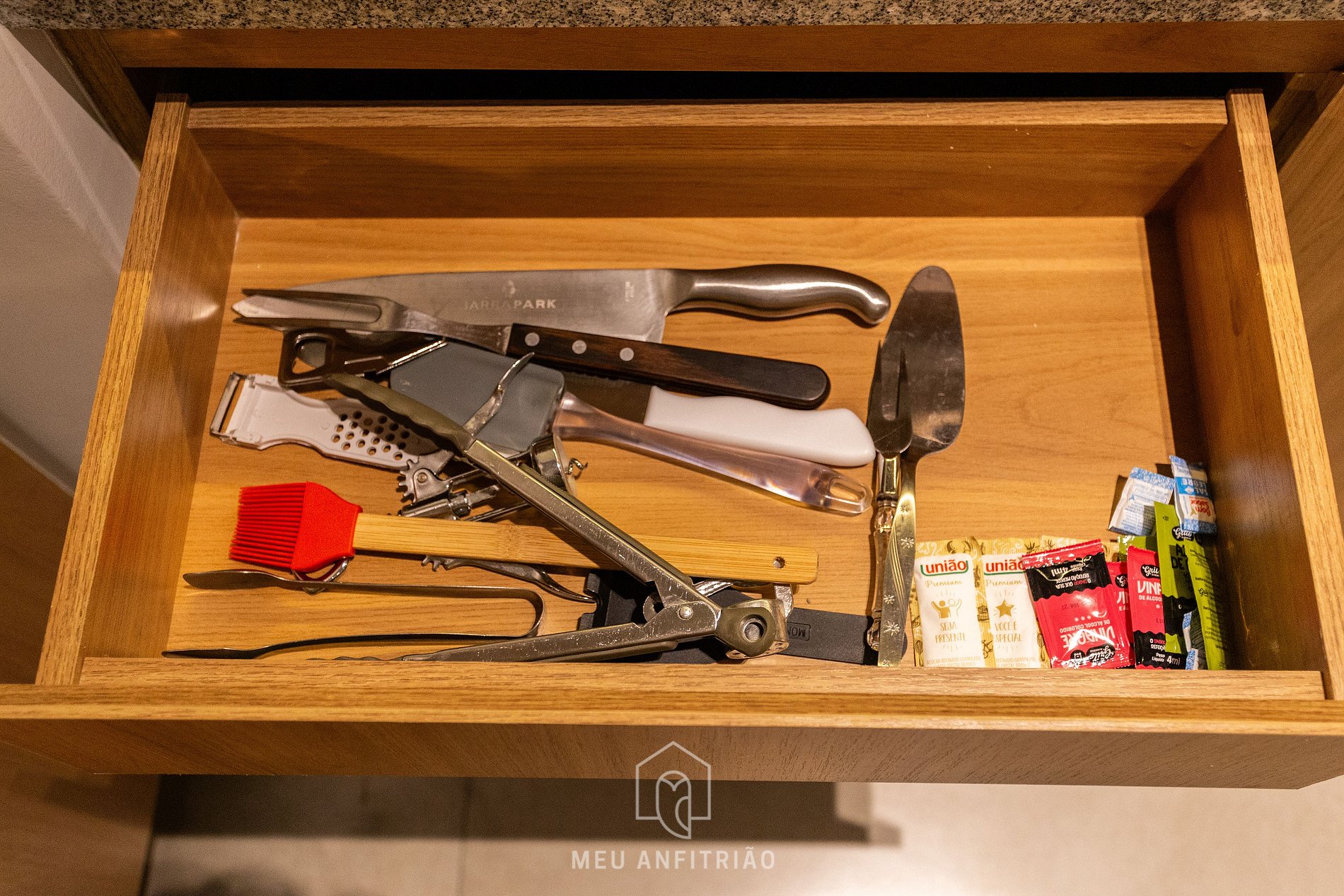 - Cozinha com os utensílios necessários para uma estadia prática, como geladeira, fogão cooktop, micro-ondas, cafeteira e chaleira elétricas, filtro d’água, air fryer, sanduicheira, liquidificador entre outros.