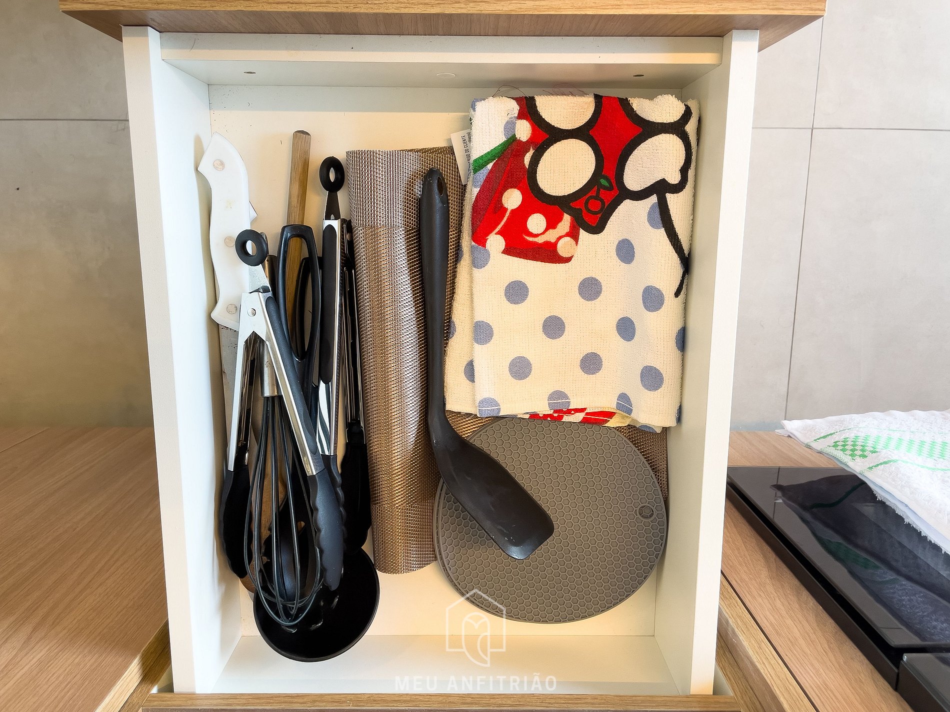 - Cozinha com geladeira, micro-ondas, cafeteira elétrica, água filtrada na pia, fogão cooktop a gás e mesa com cadeiras para refeições e mais utensílios para tornar a estadia prática e agradável.