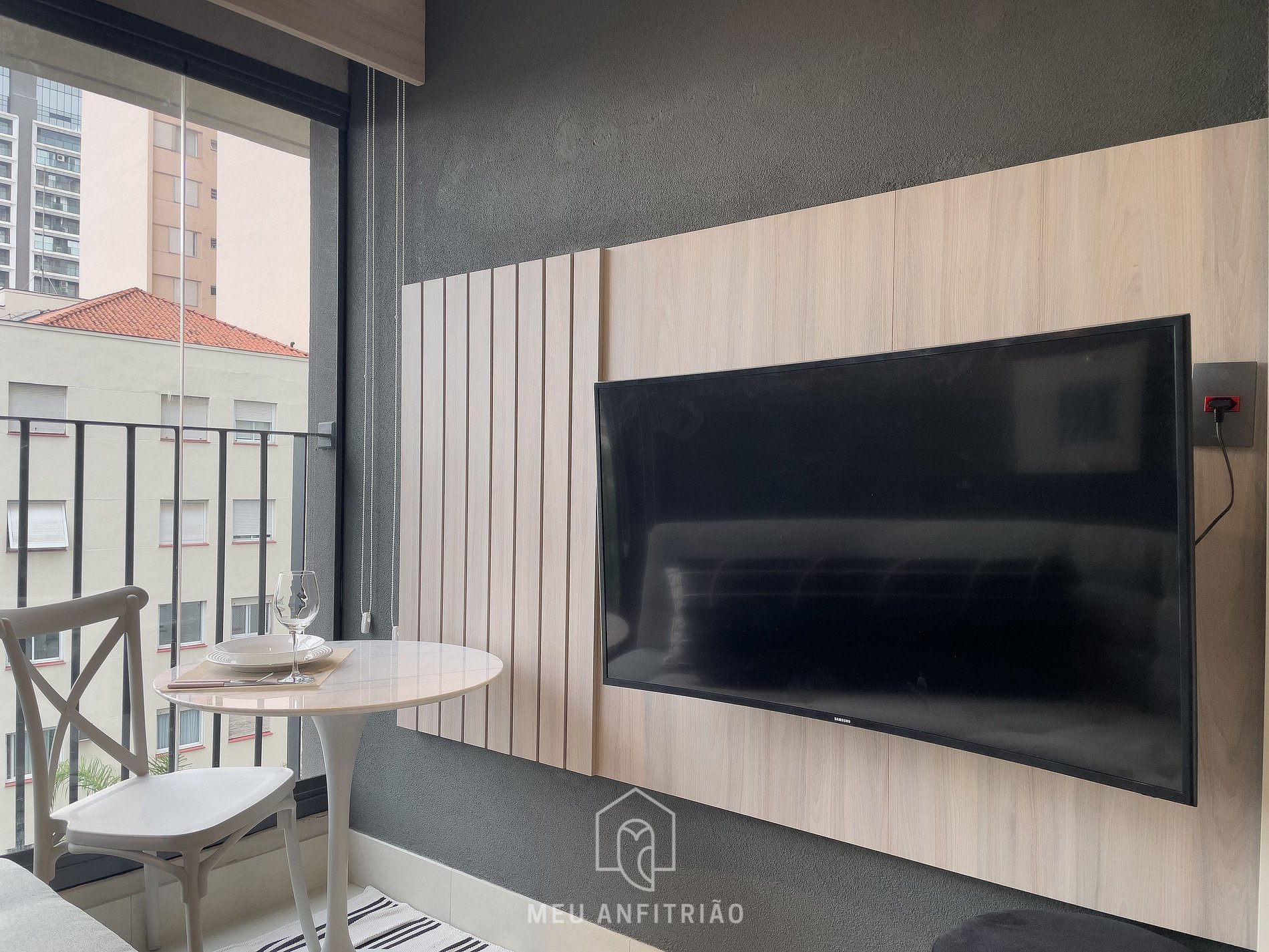 - A área do studio temos mesa para home-office, armário, ar-condicionado e cama queen. Na varanda integrada temos sofá, Smart TV, mesa para refeições e persiana blackout.