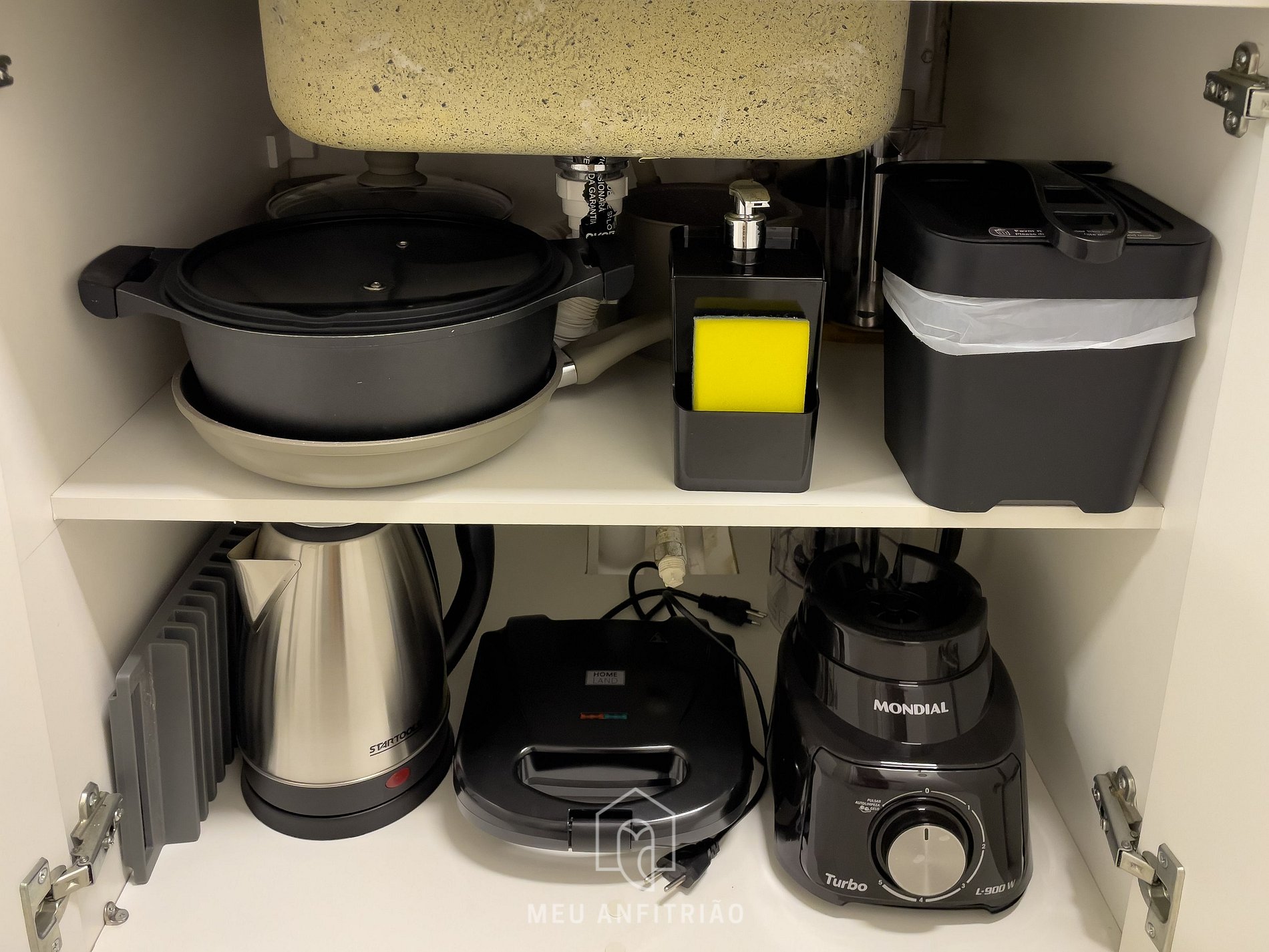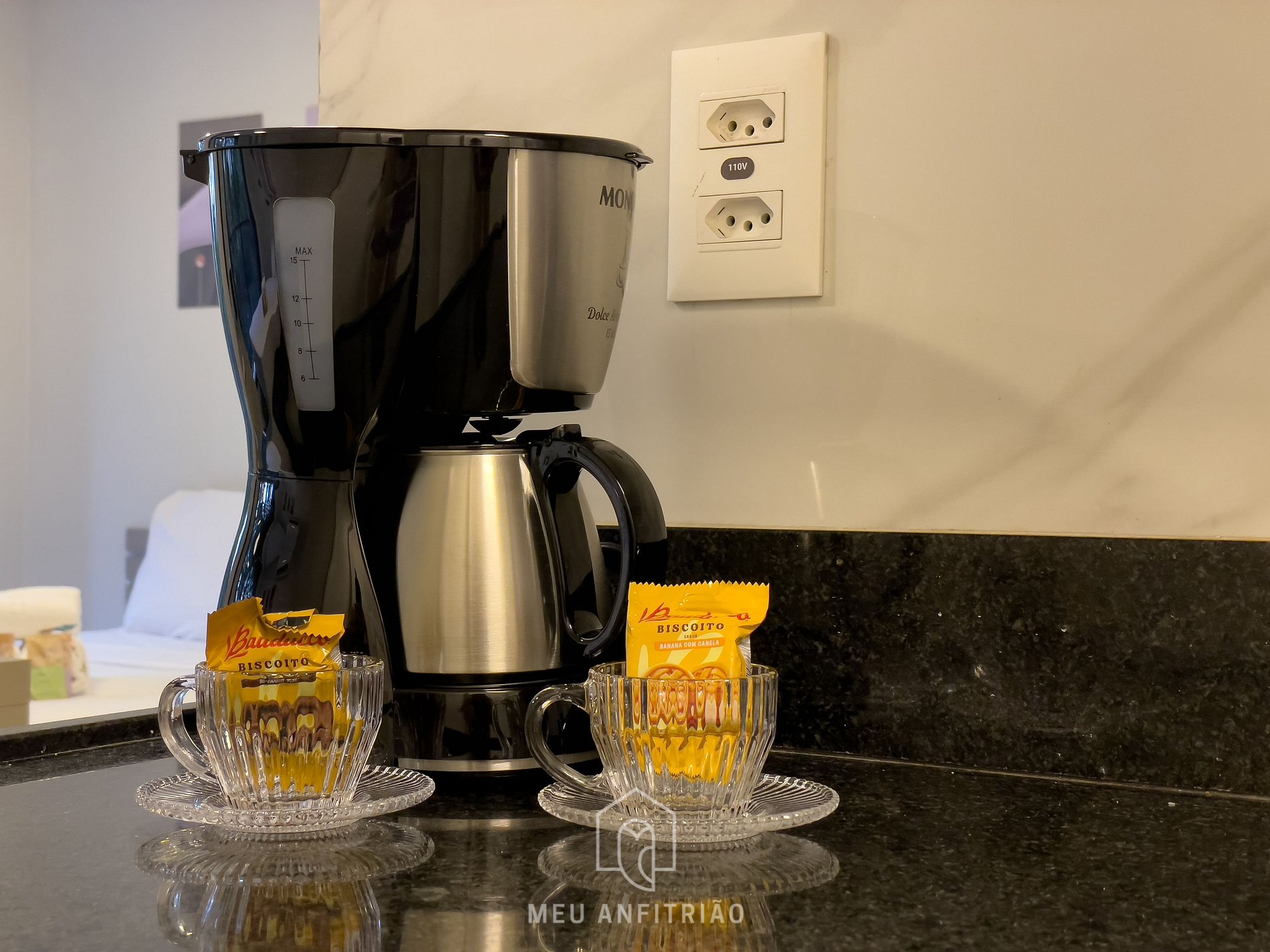 - Cozinha completa com fogão cooktop, geladeira, micro-ondas, filtro d’água, liquidificador, sanduicheira, mixer, cafeteira e chaleira elétricas, entre outros utensílios e eletrodomésticos essenciais para uma estadia confortável.