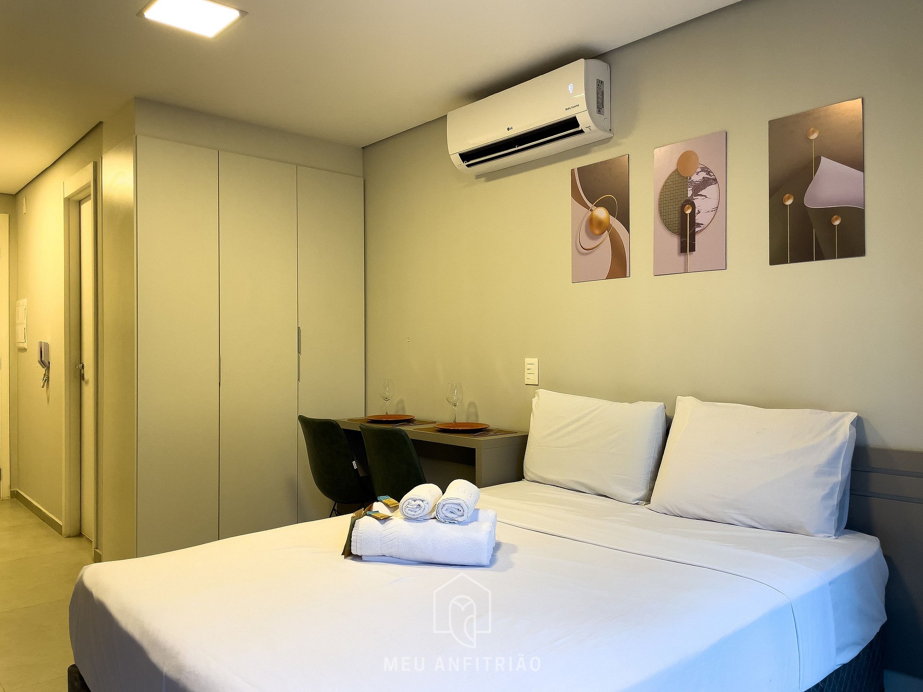 - Studio com cama de casal, ar-condicionado quente e frio, TV Smart, mesa com cadeiras para home office ou refeições, guarda-roupas e ferro de passar.
