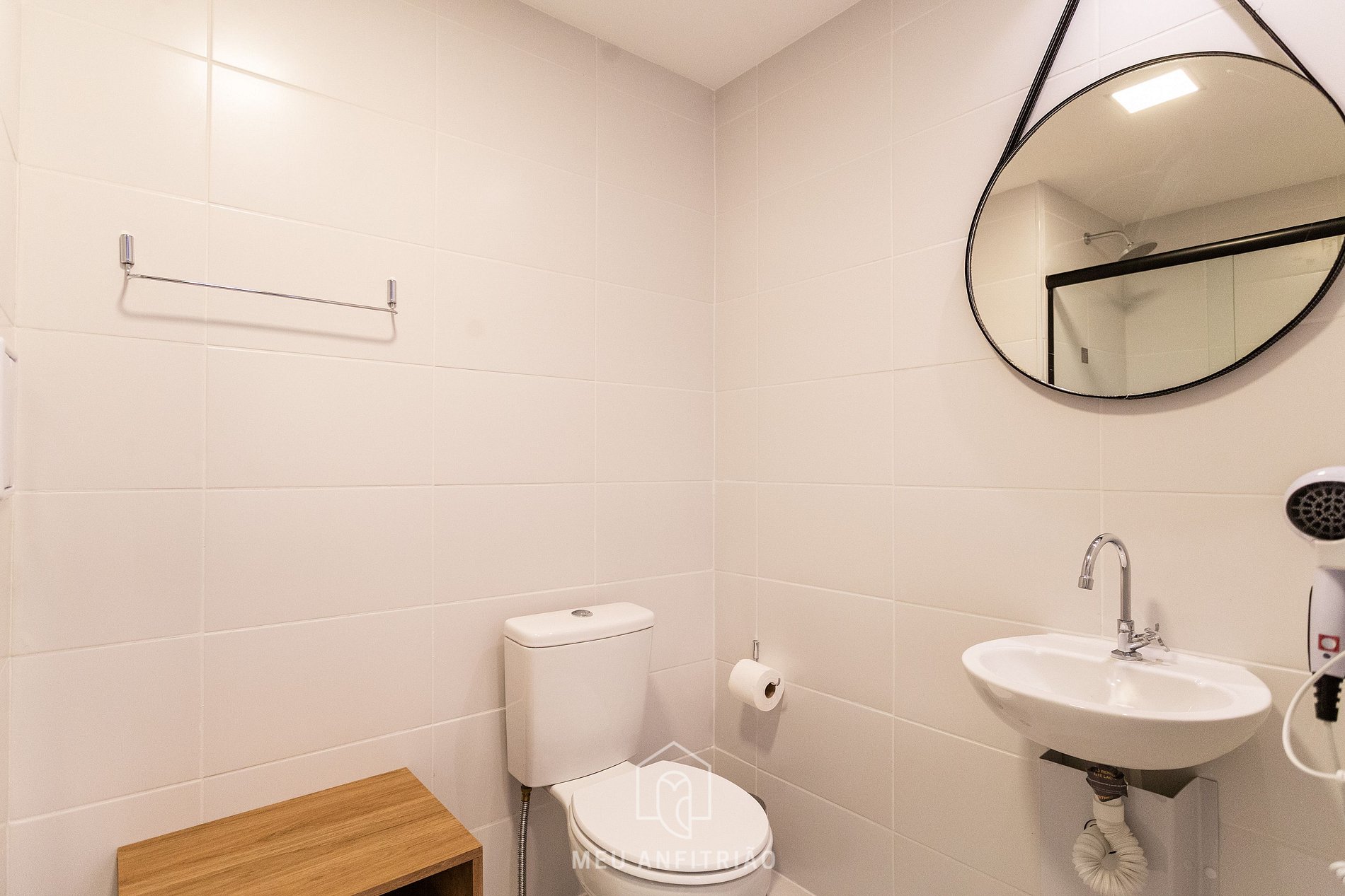 - Banheiro amplo com chuveiro a gás e secador de cabelos.
