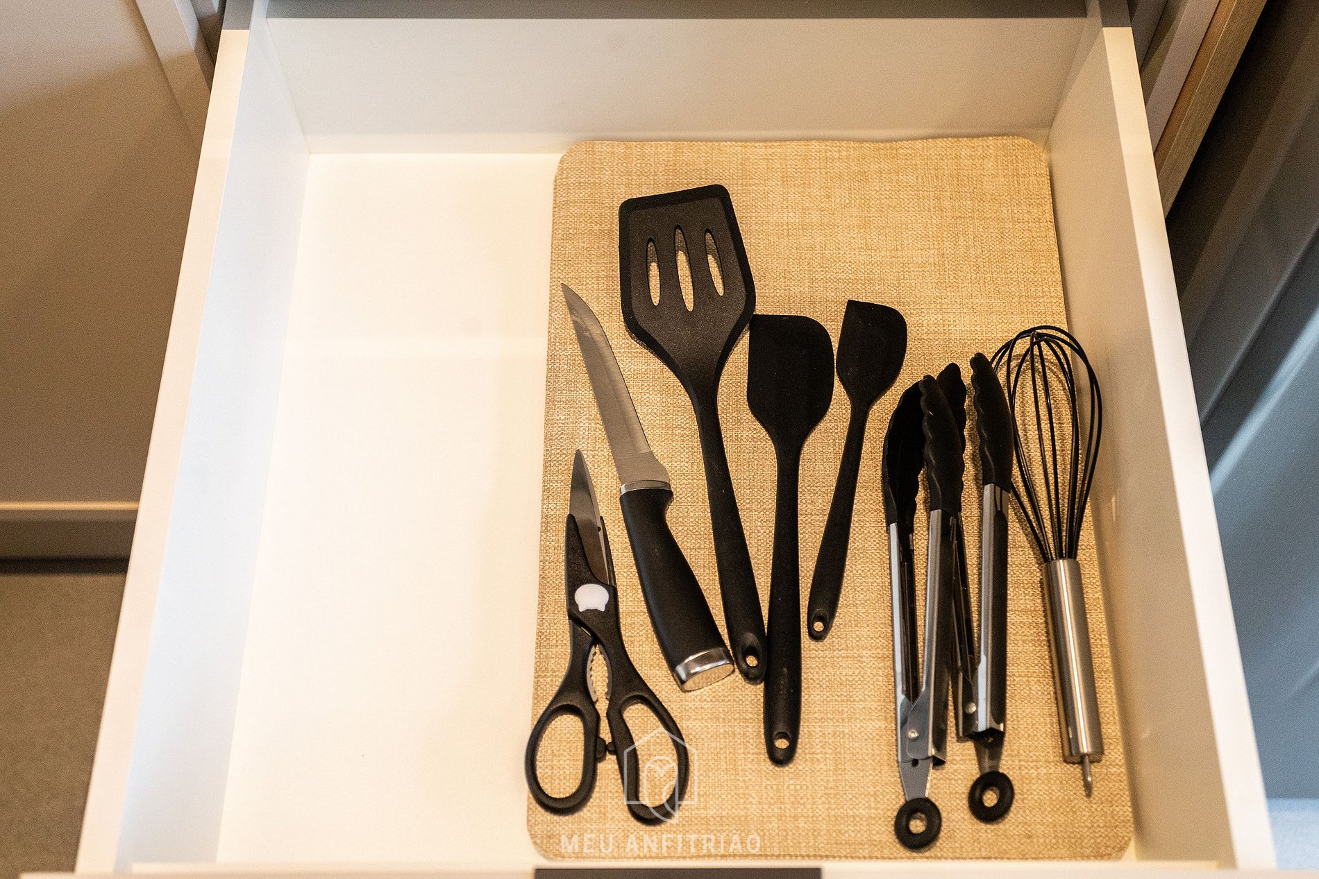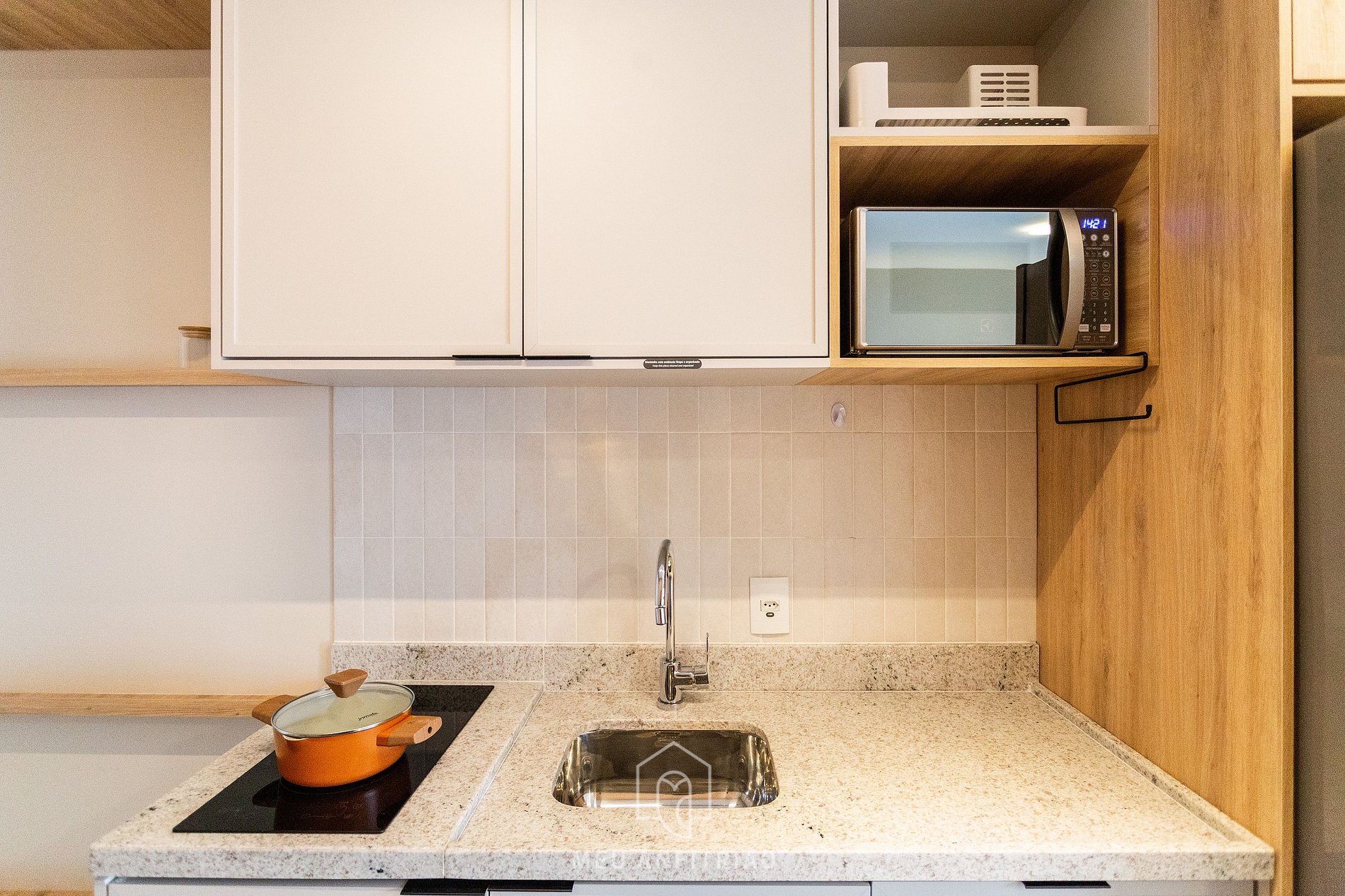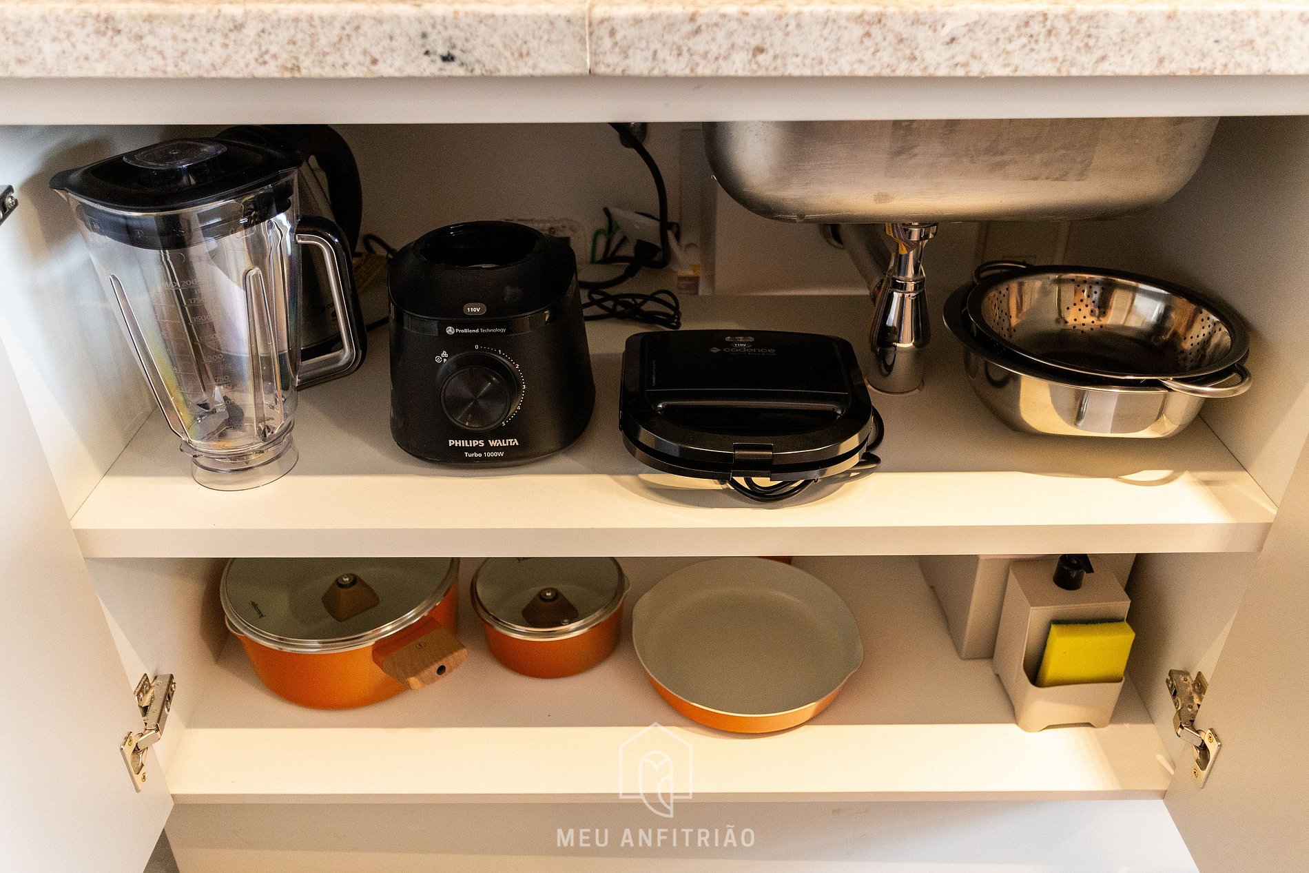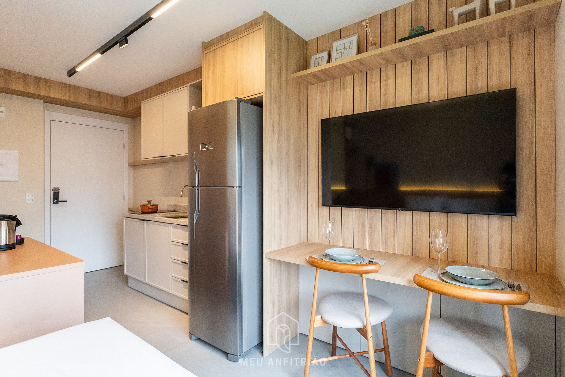 - Cozinha equipada com os utensílios e eletrodomésticos ideais para uma estadia confortável, como fogão cooktop, geladeira, micro-ondas, liquidificador, sanduicheira, chaleira elétrica, cafeteira Três Corações entre outros, além de uma bancada com banquetas para refeições ou home office.