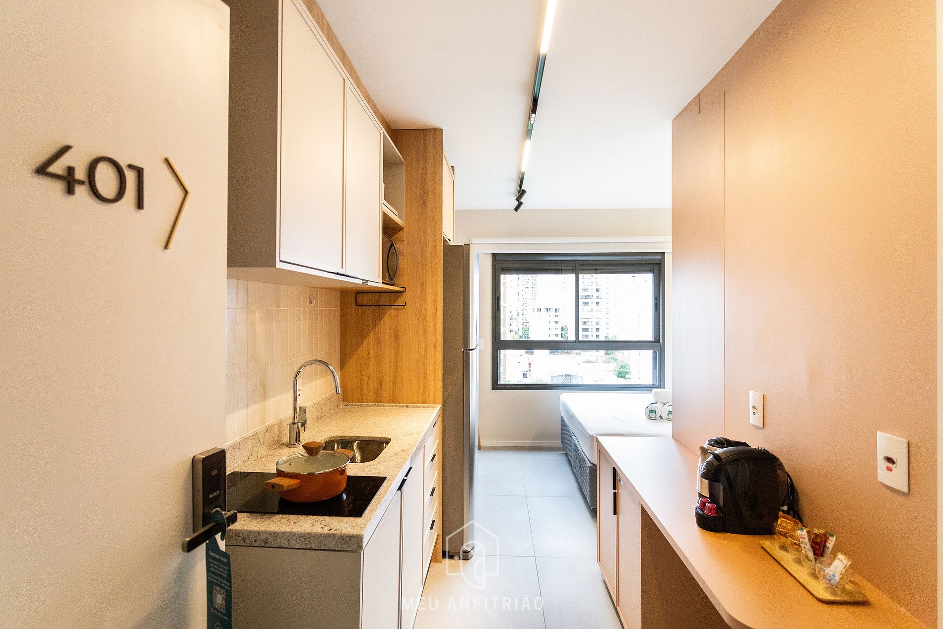 - Ambiente do studio com cama queen, guarda-roupas, TV Smart, ar-condicionado quente e frio, ferro e tábua de passar roupas e espaço para home office ou refeições com cadeiras, além de fechamento com janelas de vidro, isolamento acústico e persianas blackout.