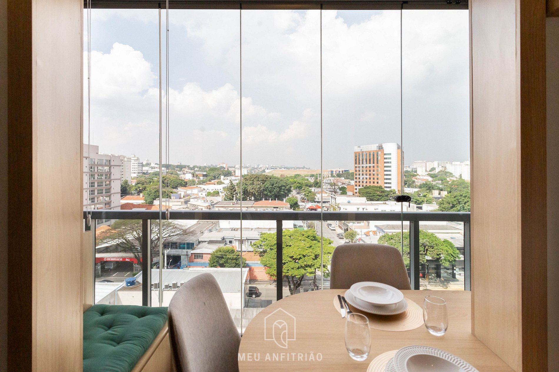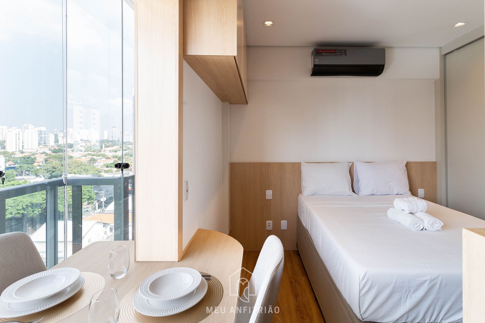 Nosso apartamento acomoda até 2 pessoas. Ao entrar, o hóspede terá acesso à cozinha, equipada com os utensílios necessários para uma estadia prática, como micro-ondas com air fryer, geladeira, fogão cooktop, cafeteira Nespresso, filtro d’água, liquidificador, entre outros. Na varanda, temos uma mesa para refeições ou home office com cadeiras, além de uma vista ampla da cidade e do Aeroporto de Congonhas por estarmos no 8º andar. Na área do quarto, dispomos de uma cama de casal, ar-condicionado quente e frio e armários.