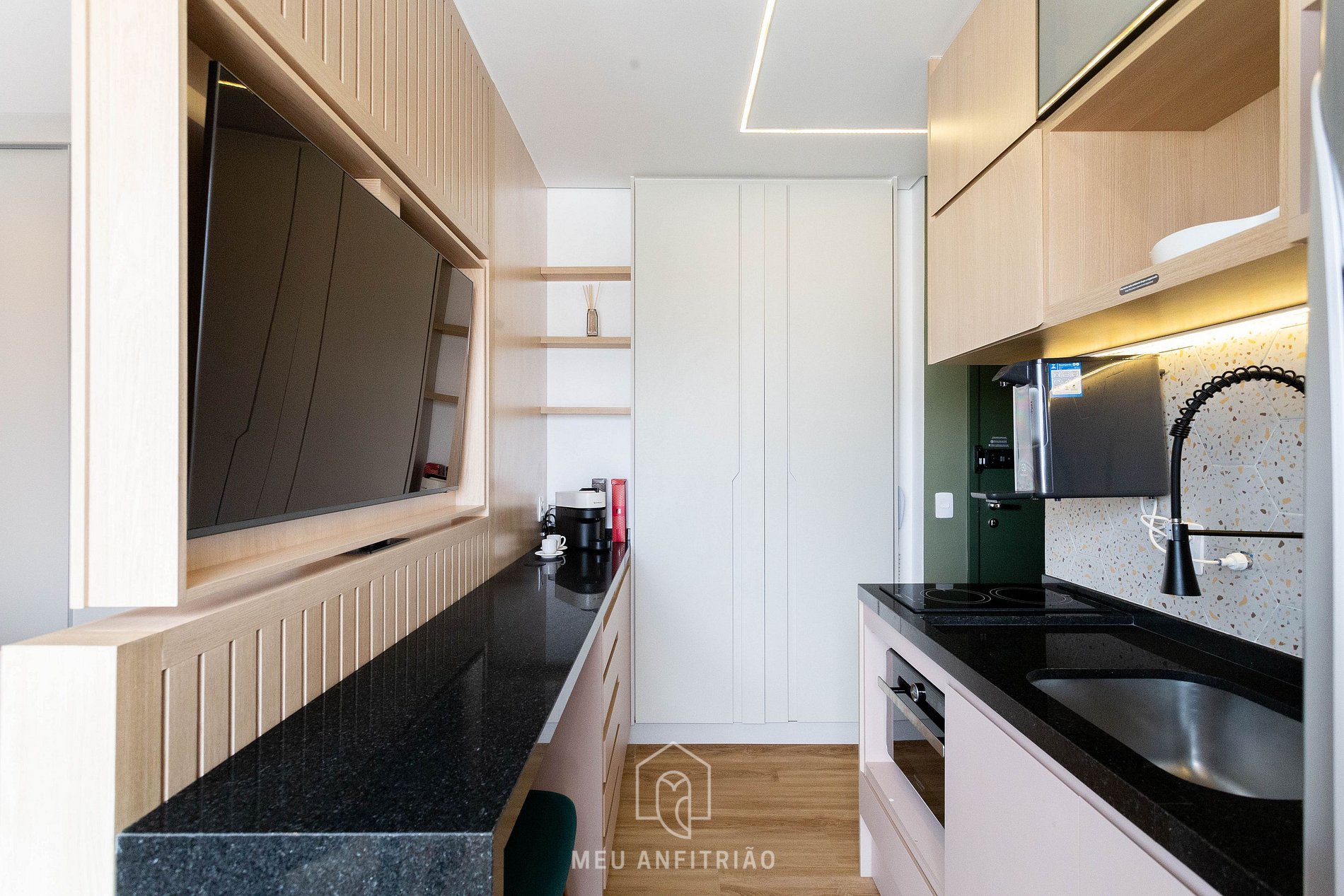 Disponibilizamos também WI-FI de alta velocidade, banheiro com chuveiro a gás e TV Smart giratória que pode ser usada para a cozinha, quarto ou varanda.