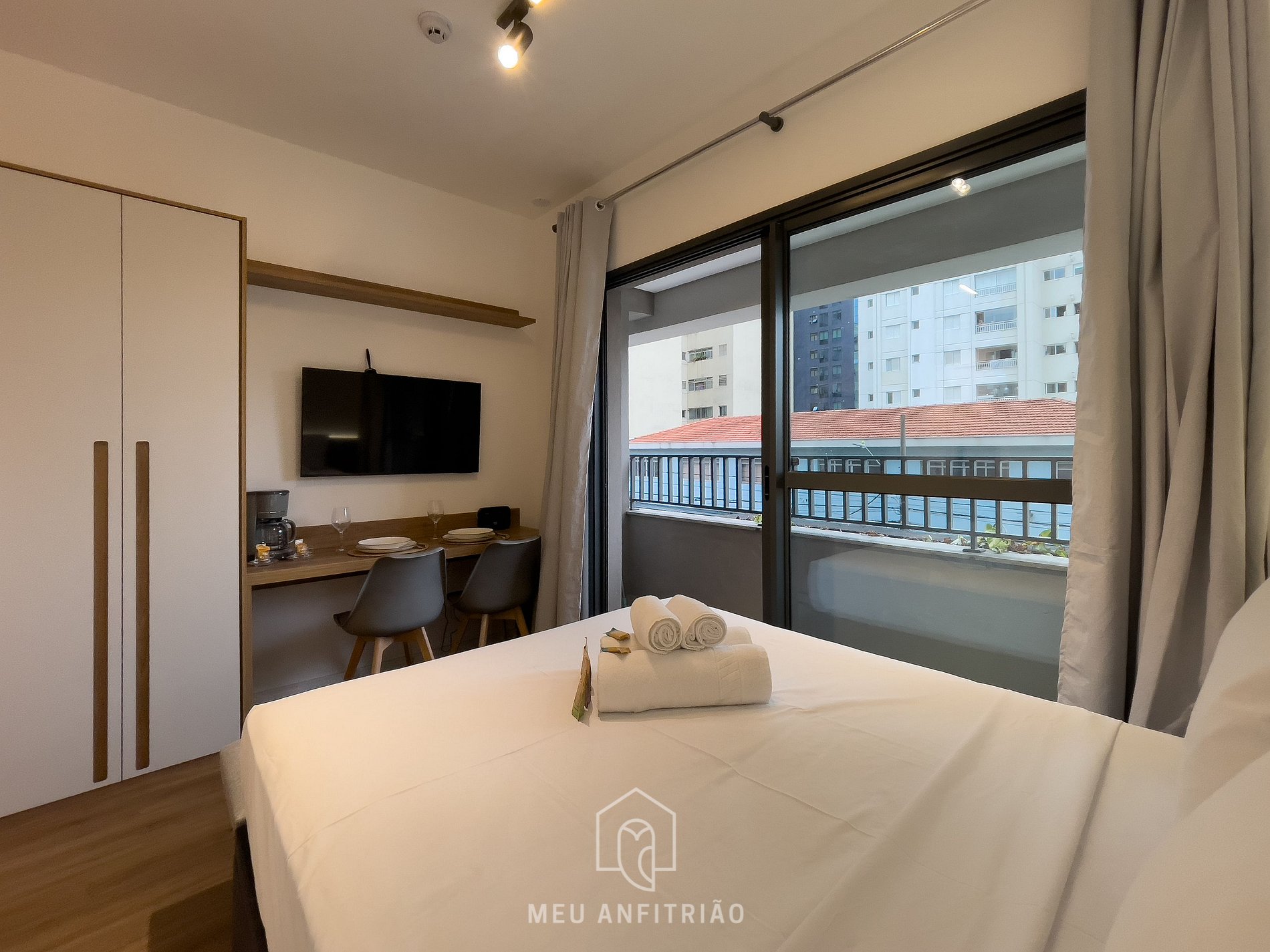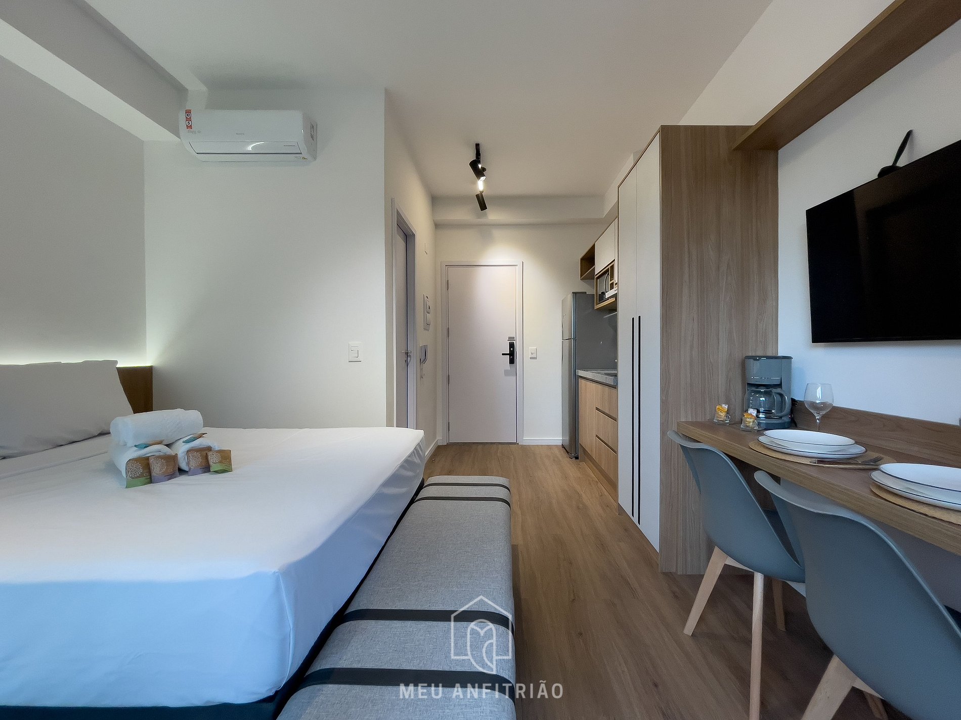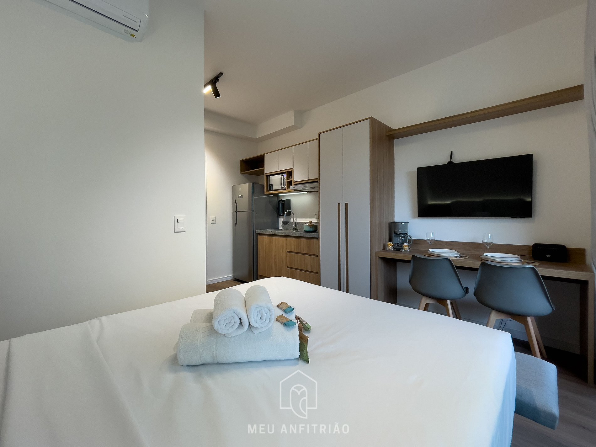 - Área tipo estudio con cama doble, mesa con sillas para comidas o trabajo remoto, TV Smart Samsung y aire acondicionado.