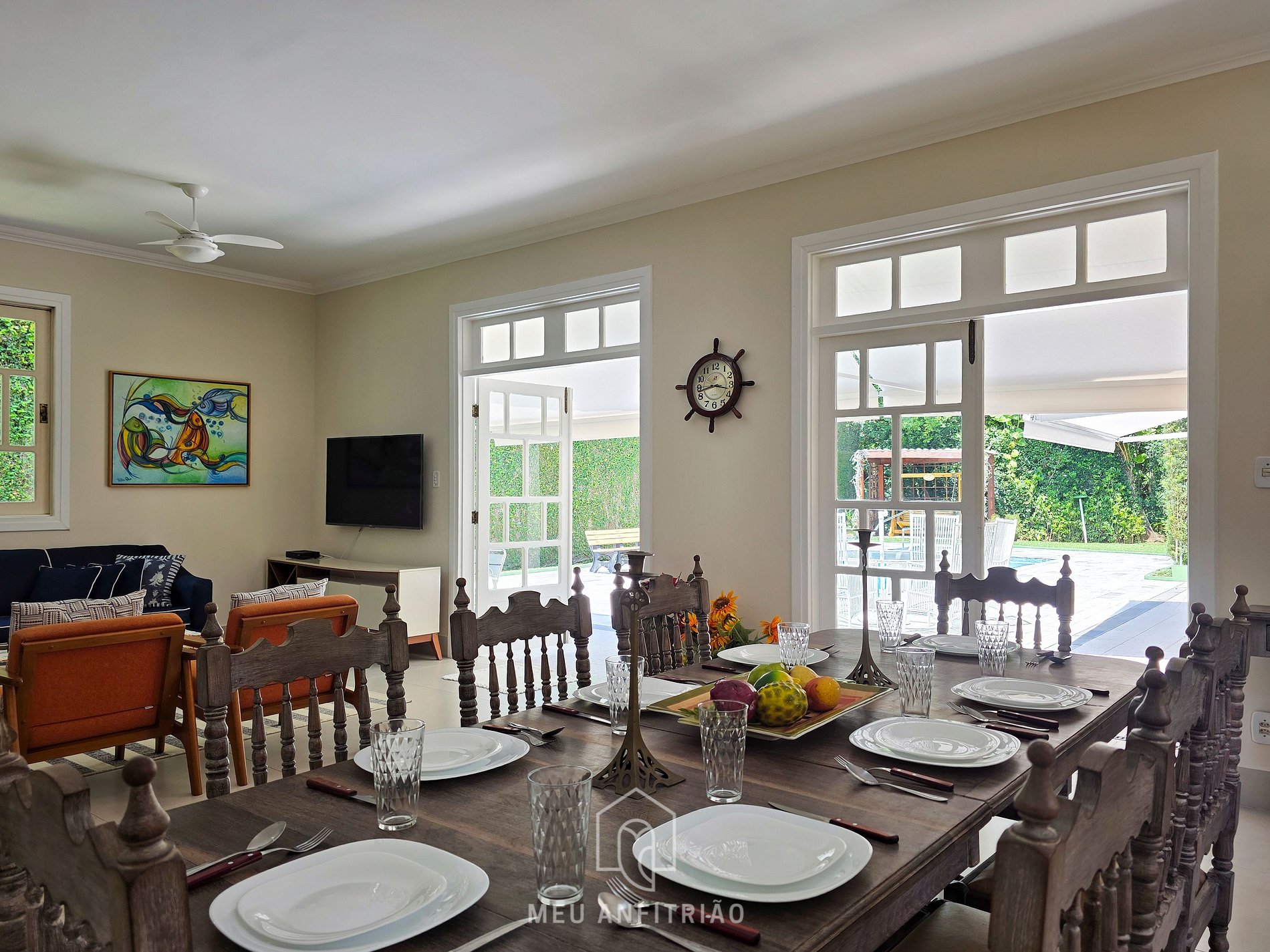 - Uma sala de estar logo na entrada da casa, espaçosa, com sofás, TV Smart, um barzinho e mesa para jogos. No mesmo ambiente, há também uma sala de jantar, que conta com uma mesa com oito lugares.