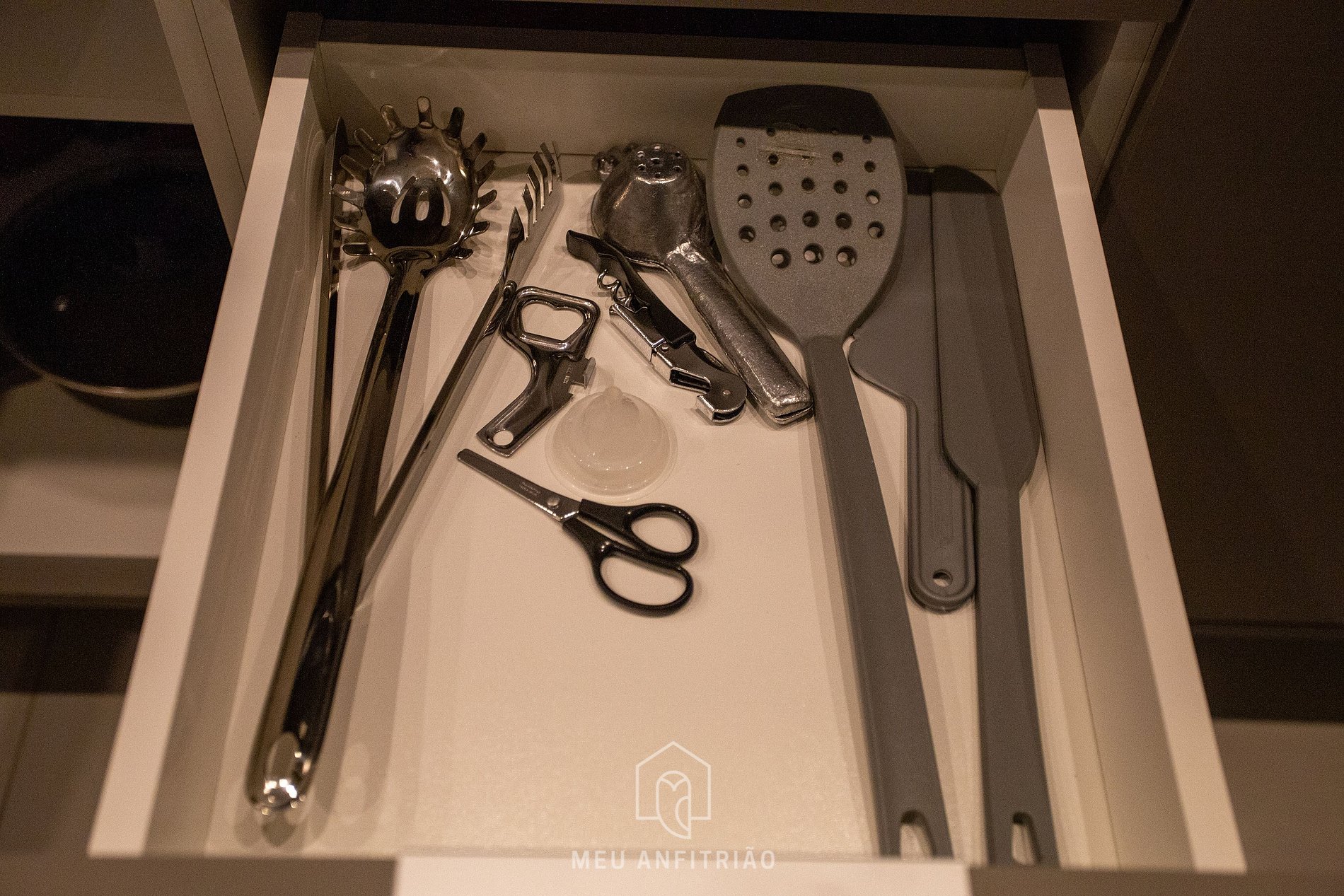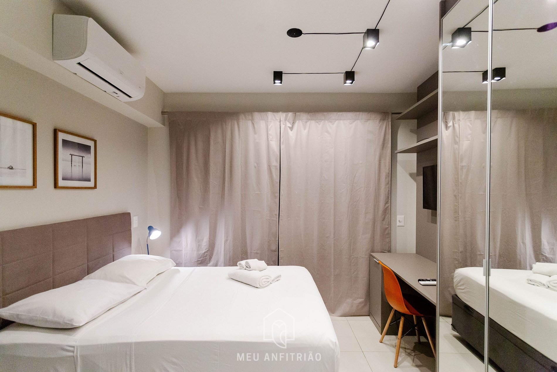 No mesmo ambiente dispomos de uma cozinha com utensílios necessários para uma estadia prática, banheiro, armário, escrivaninha para home office, TV Smart e cafeteira Nespresso, mas é necessário levar as próprias cápsulas. É possível comprá-las na loja de conveniência do condomínio que fica no térreo dentro do coworking.