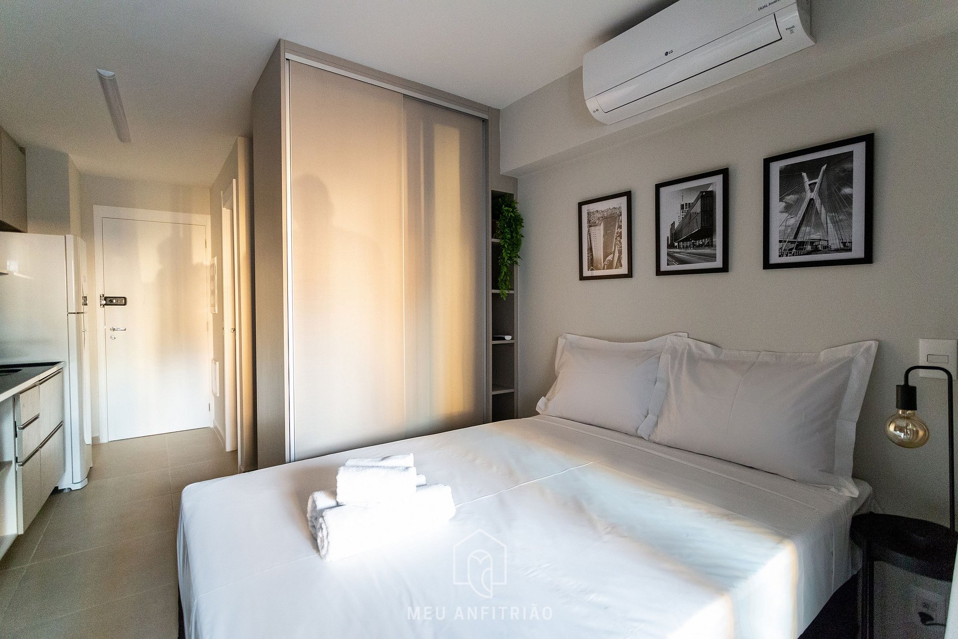 O ambiente do studio é em conceito aberto e acomoda até 2 pessoas em cama de casal.