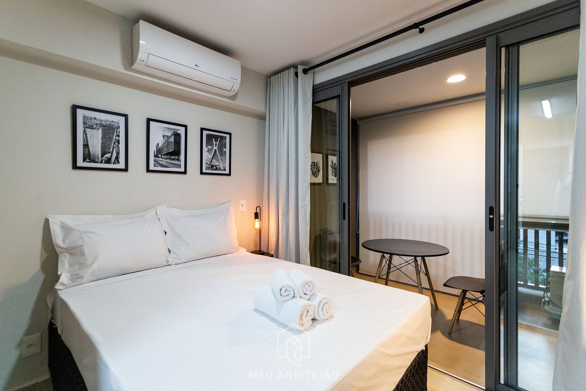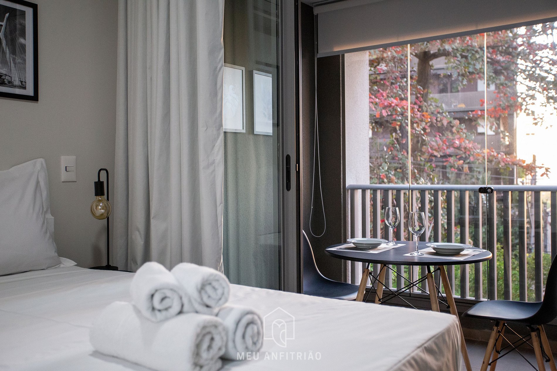No mesmo ambiente dispomos de uma cozinha com utensílios necessários para a estadia, banheiro, armário, escrivaninha para home office e TV Smart. Uma varanda com porta de vidro separa os espaços. No local há uma mesa com cadeiras e para proveito do ambiente externo. Para um ambiente mais aconchegante, contamos com cortina blackout na divisão do apartamento para a sacada.