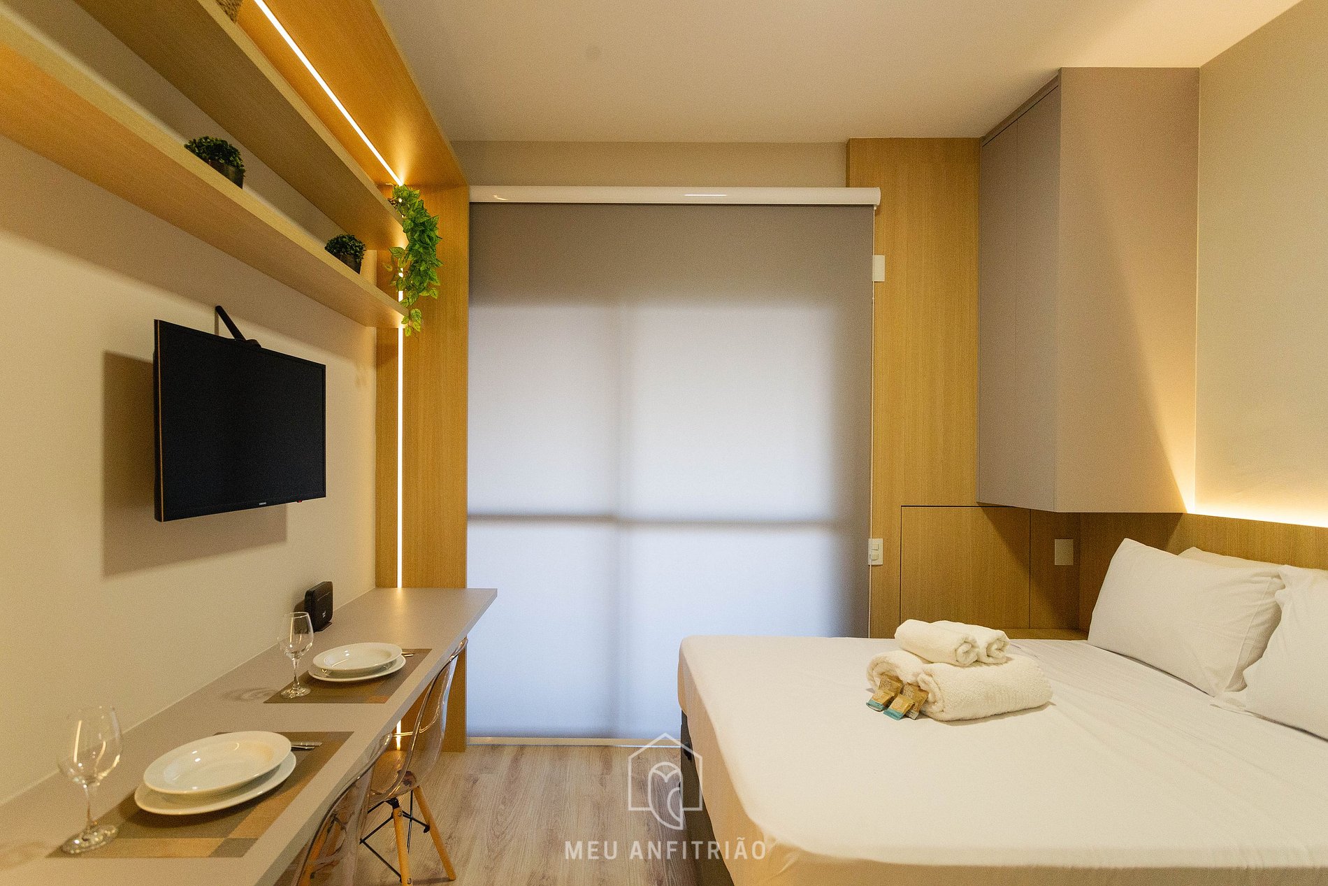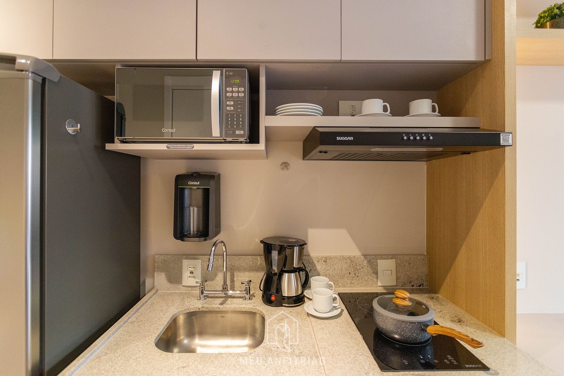 Ao entrar no studio, o hóspede terá acesso à cozinha, que conta com os utensílios necessários para a estadia, como geladeira, fogão cooktop, sanduicheira, micro-ondas, liquidificador, filtro d’água, entre outros. Uma varanda com porta de vidro e vista para a cidade divide os espaços.