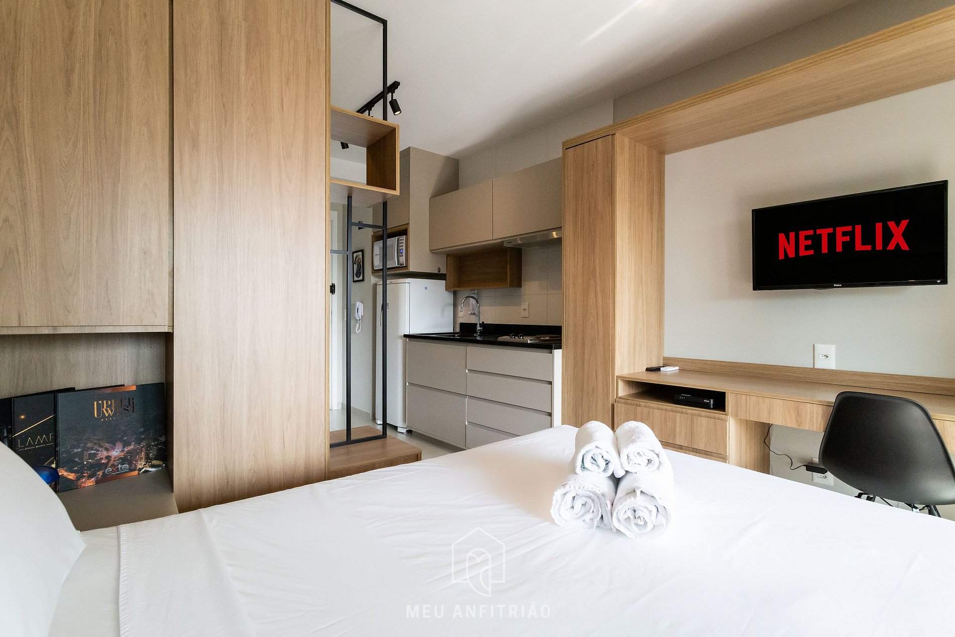 Este studio em conceito aberto acomoda até duas pessoas com conforto e praticidade. O espaço conta com cama de casal, cozinha equipada com utensílios básicos, banheiro, armário, escrivaninha ideal para home office e TV Smart. A varanda, separada por porta de vidro, traz mais luminosidade ao ambiente e conta com mesa e cadeiras para refeições.