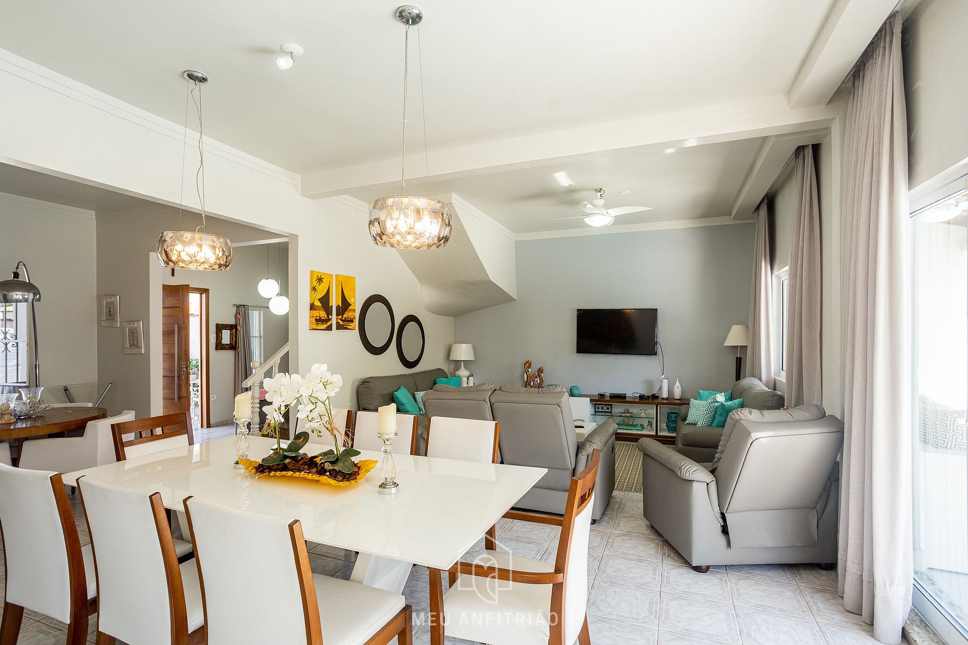 Logo ao entrar na casa, o hóspede terá acesso à uma sala de estar com televisão e sofás ao lado de uma sala de jantar que possui uma mesa com oito lugares. A cozinha é completa com os utensílios necessários para a estadia e conta com ventilador de teto para os dias mais quentes.