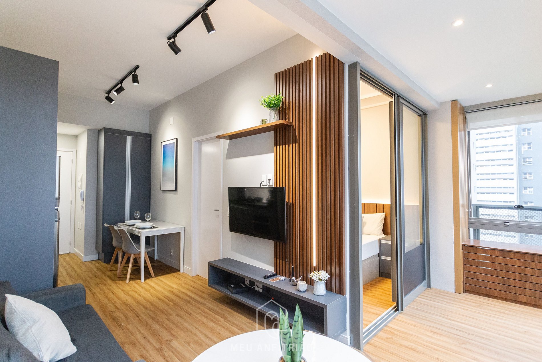 Uma ótima divisão. Meus pais se hospedaram e foi ótimo ter a divisão do quarto e da área de sala/cozinha. Meus pais conseguiram se acomodar com tranquilidade e um podia assistir TV enquanto o outro dormia sem incomodar (eles adoraram esse ponto). O andar possui vista e persianas. Ótimo prédio, reservaria novamente.