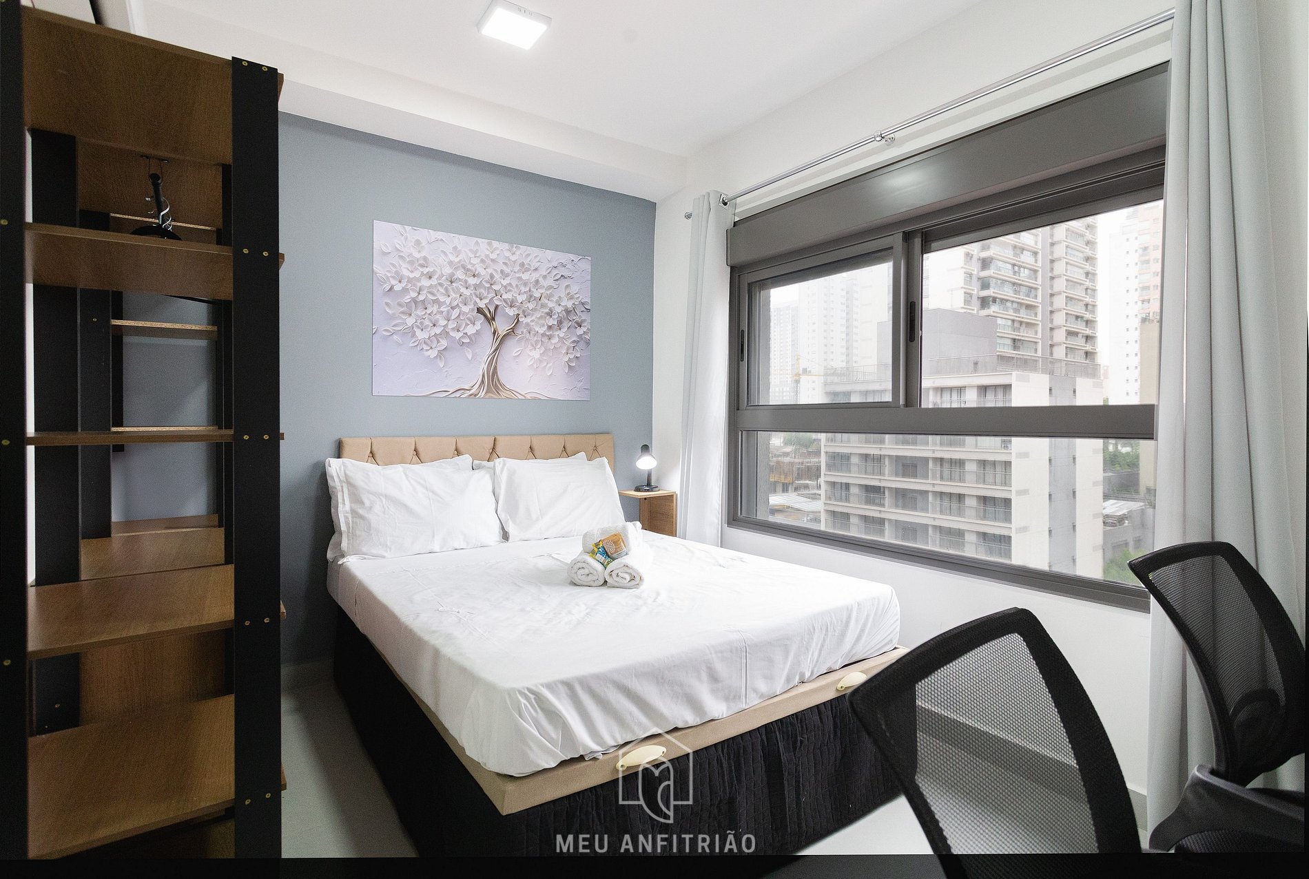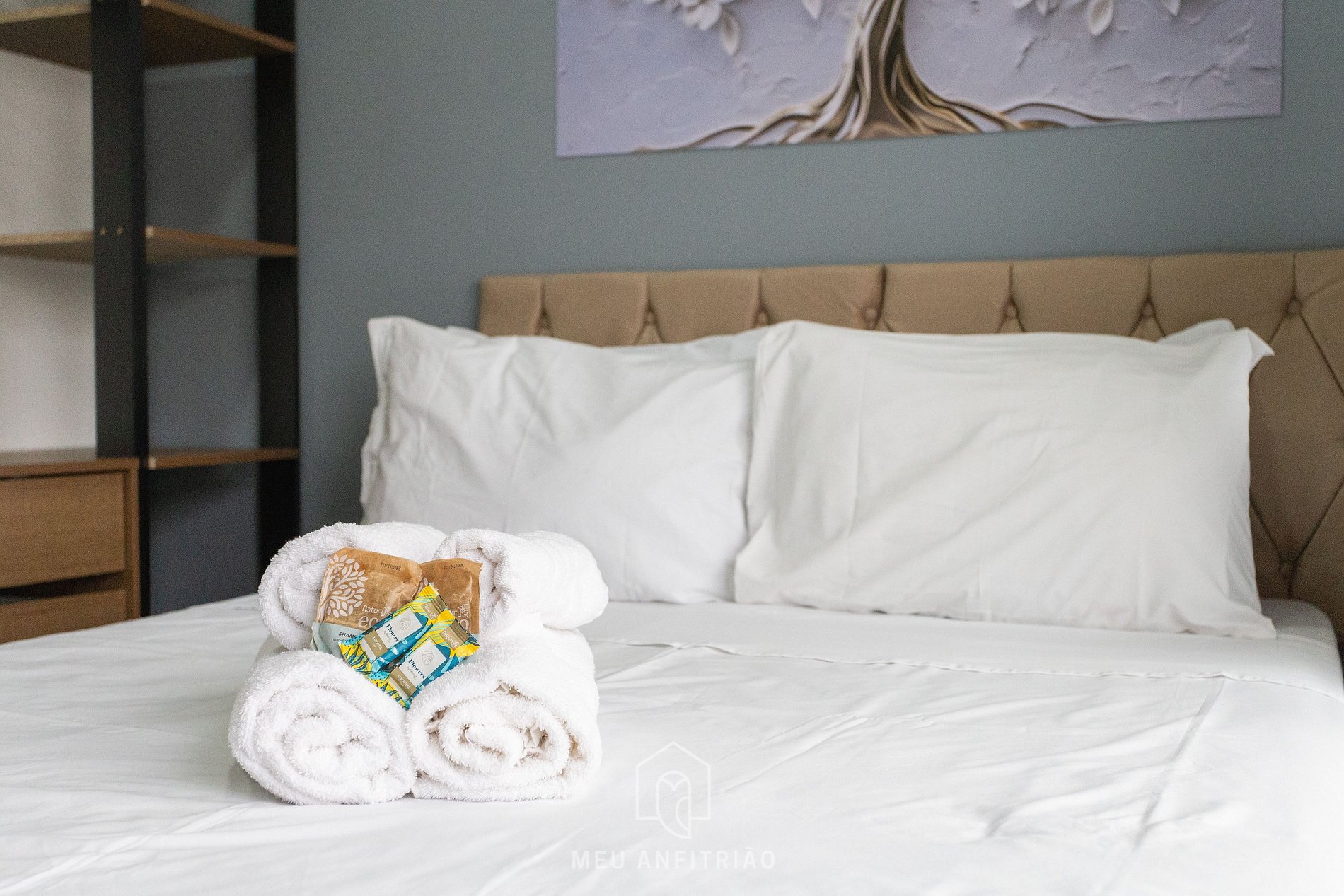 Nosso studio acomoda até 2 pessoas em uma cama de casal em um espaço de aproximadamente 20m². O condomínio possui área de lazer completa e portaria presencial 24h.