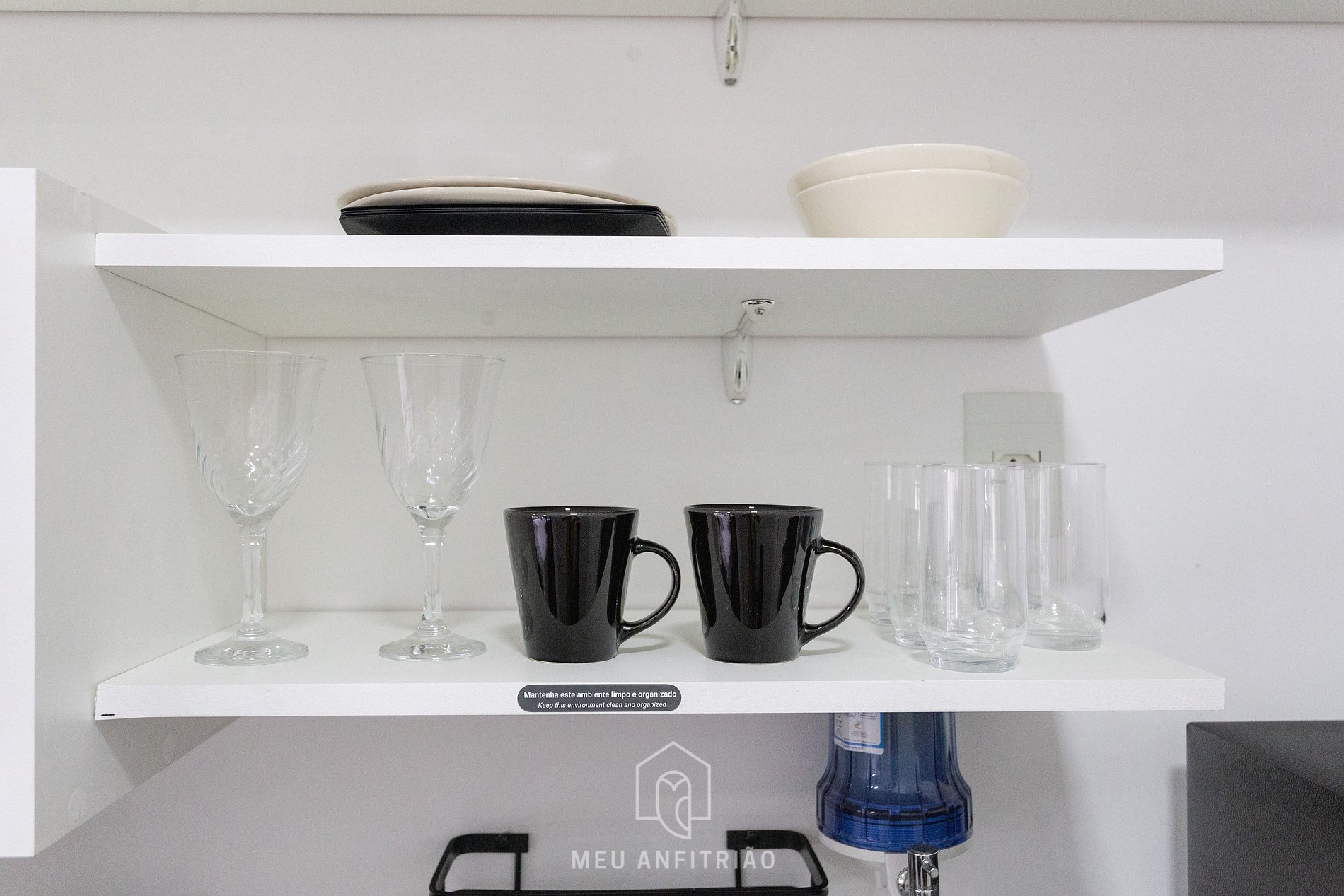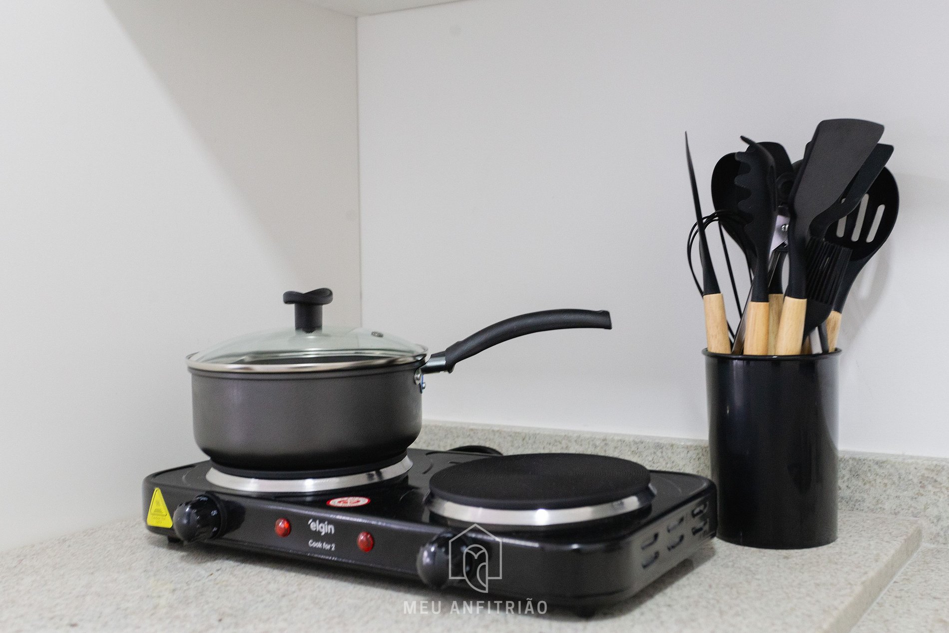 Ao entrar no studio, o hóspede terá acesso à cozinha, que conta com geladeira, fogão cooktop, microondas, cafeteira elétrica, sanduicheira entre outros utensílios necessários para a estadia, além de uma mesa de apoio com cadeira.