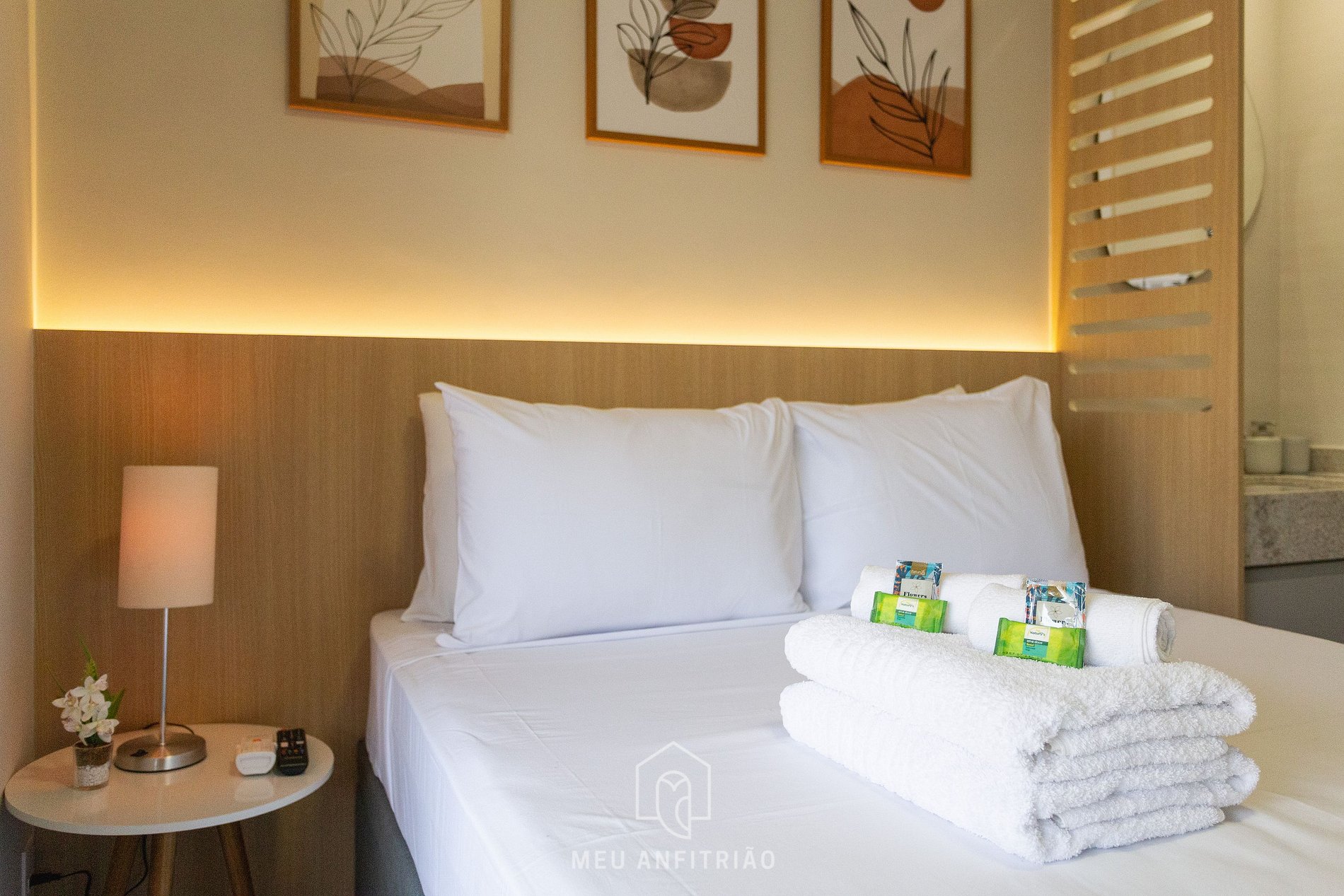 Acomodamos até 2 pessoas em uma cama de casal, em um espaço de aproximadamente 25m². O condomínio possui área de lazer completa e portaria presencial 24h.