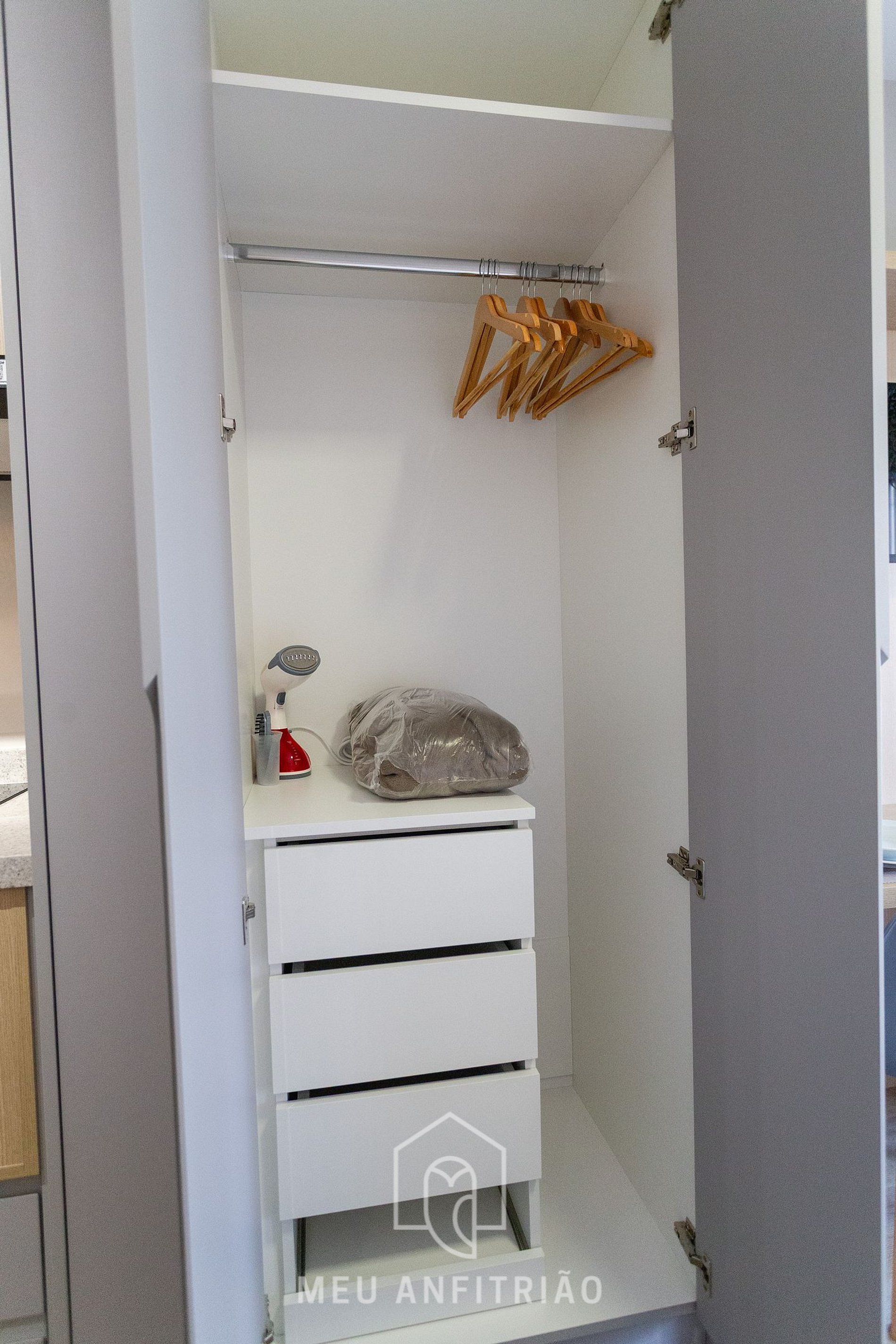 Ao entrar, o hóspede terá acesso à cozinha, que conta com geladeira, fogão cooktop, microondas, sanduicheira, liquidificador, cafeteira elétrica entre outros. A varanda conta com persianas blackout e uma vista para a rua.