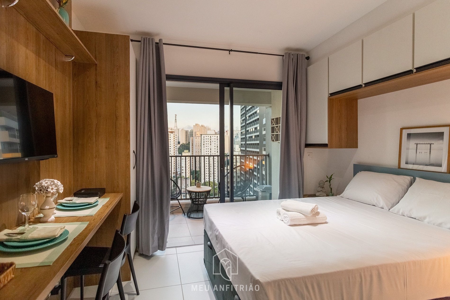 No mesmo ambiente dispomos de uma cozinha com utensílios necessários para uma estadia prática, banheiro, armário, mesa para refeições e homeoffice e TV Smart.