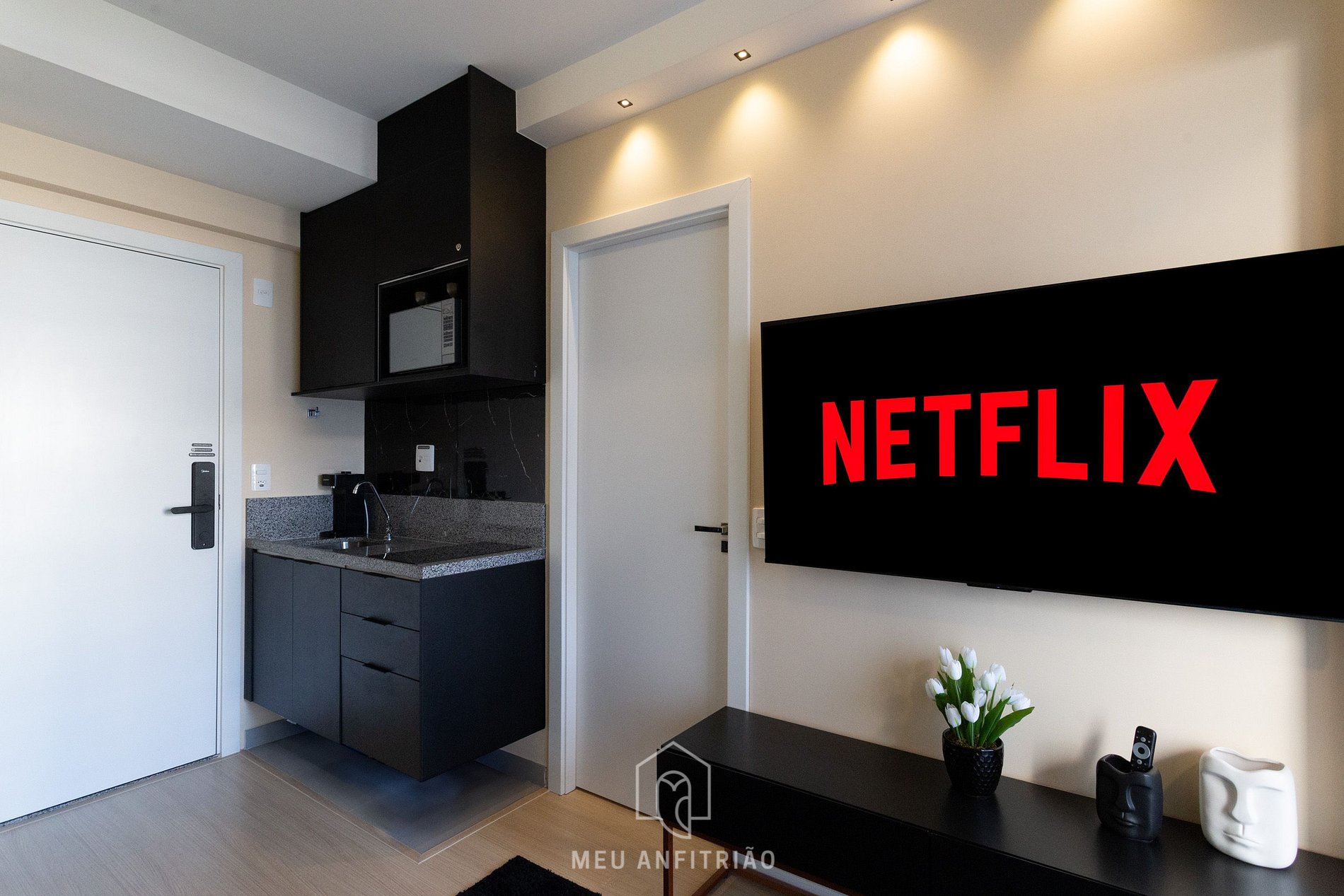 A sala conta com sofá, TV smart e escrivaninha para home office e temos uma varanda com mesa bistrô com banquetas para proveito do hóspede.