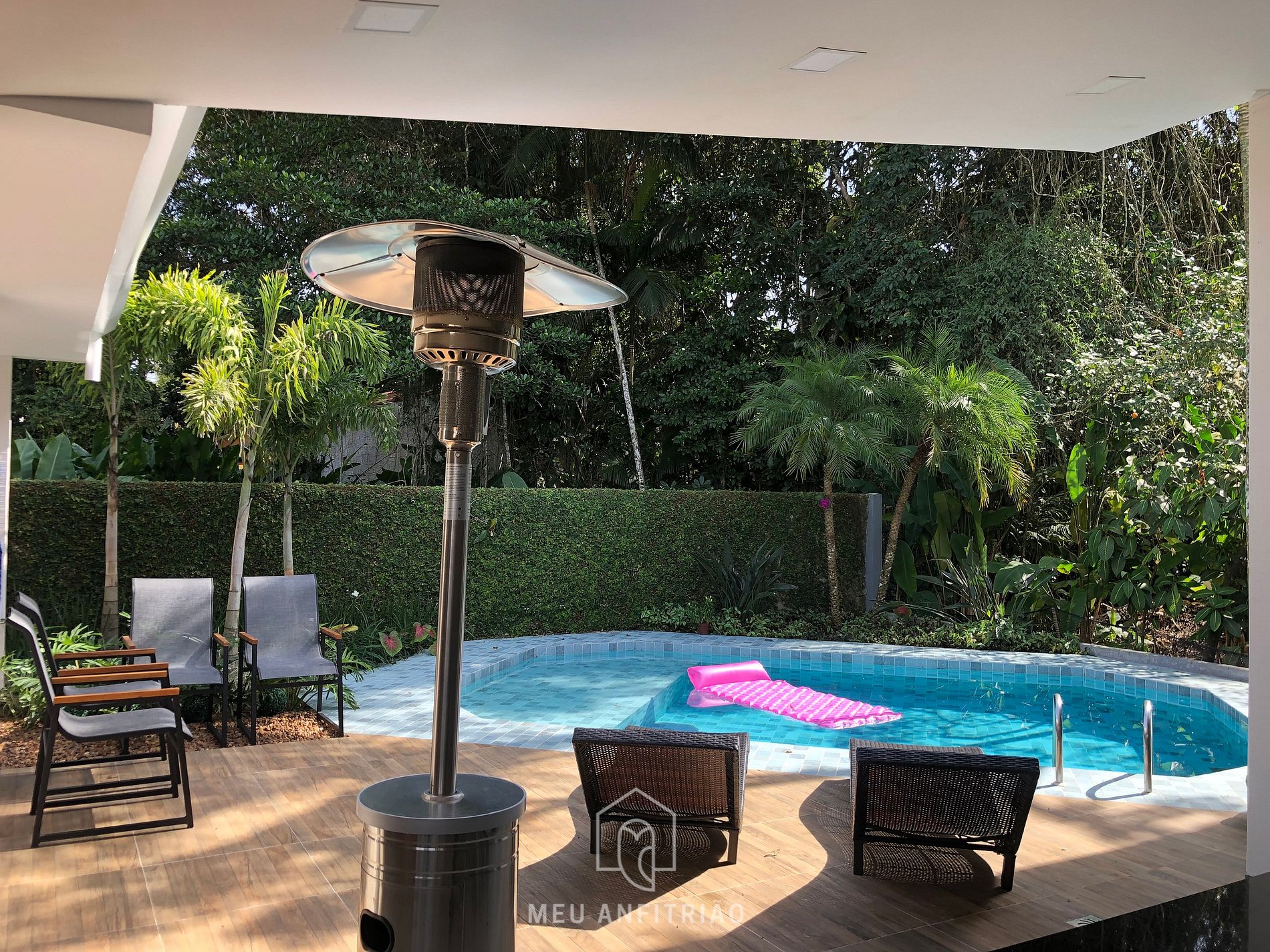Da sala, é possível acessar a área externa, nela há um espaço integrado por piscina, ofurô e área gourmet com churrasqueira. Para dias mais frios, contamos com um aquecedor.