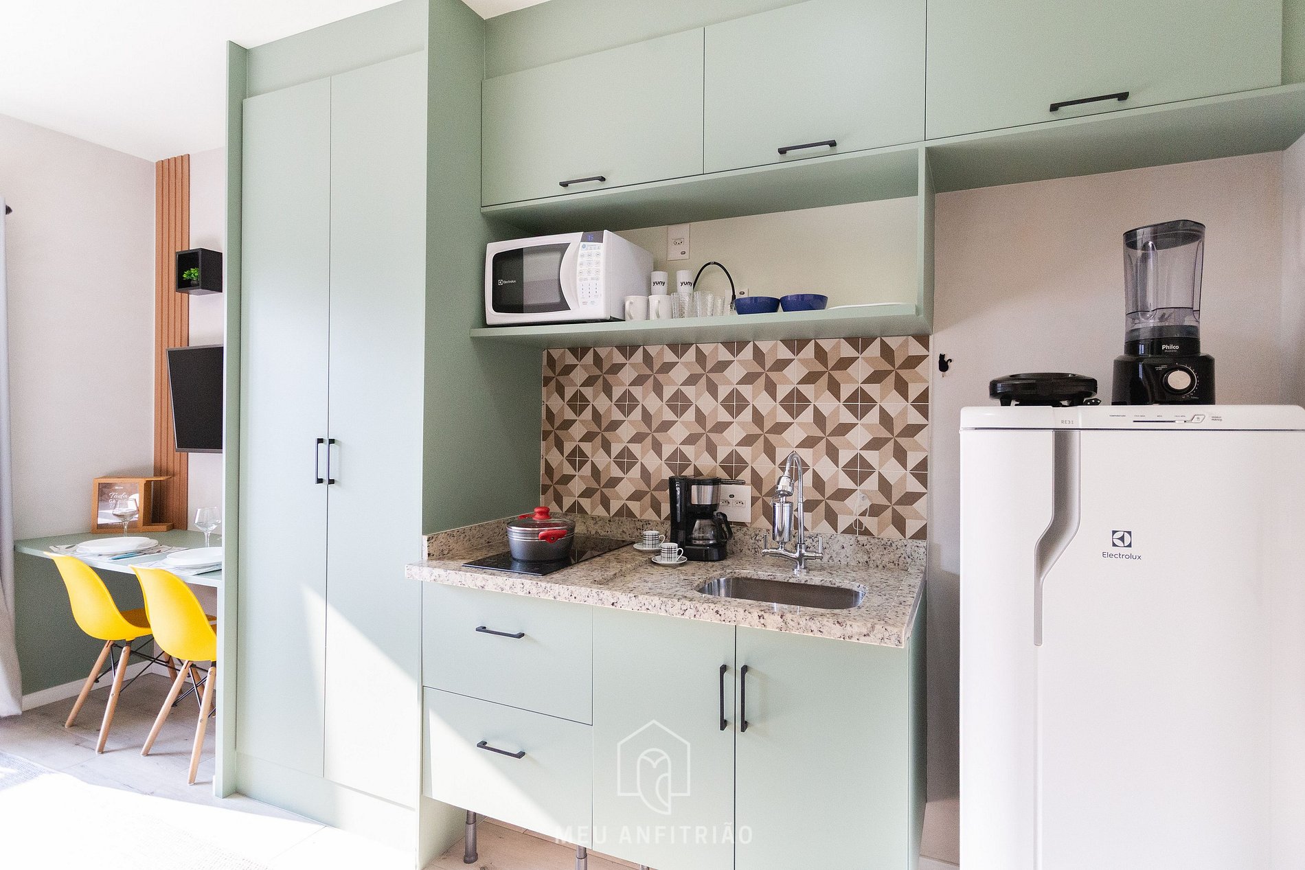Ao entrar, o hóspede terá acesso à cozinha, que conta com os utensílios necessários para uma estadia prática, como geladeira, fogão cooktop, micro-ondas, sanduicheira, cafeteira elétrica, liquidificador entre outros. Contamos com uma varanda com porta de vidro, cortinas blackout e vista para a cidade.