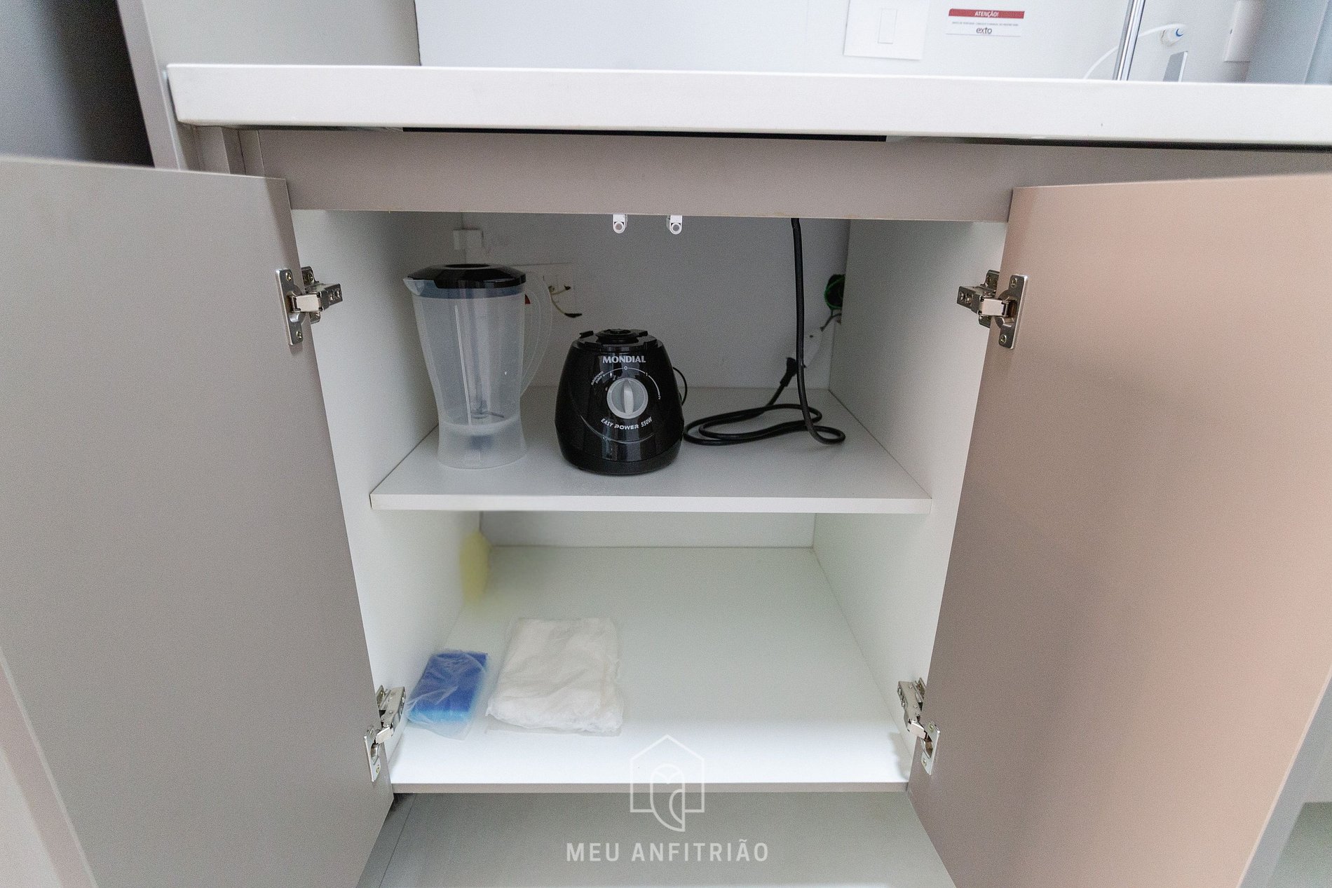 Entrando no studio, o hóspede terá acesso à cozinha, que conta com os utensílios essenciais para uma estadia prática, como geladeira, fogão cooktop, micro-ondas, filtro d’água, sanduicheira, cafeteira Delta Q, liquidificador entre outros.