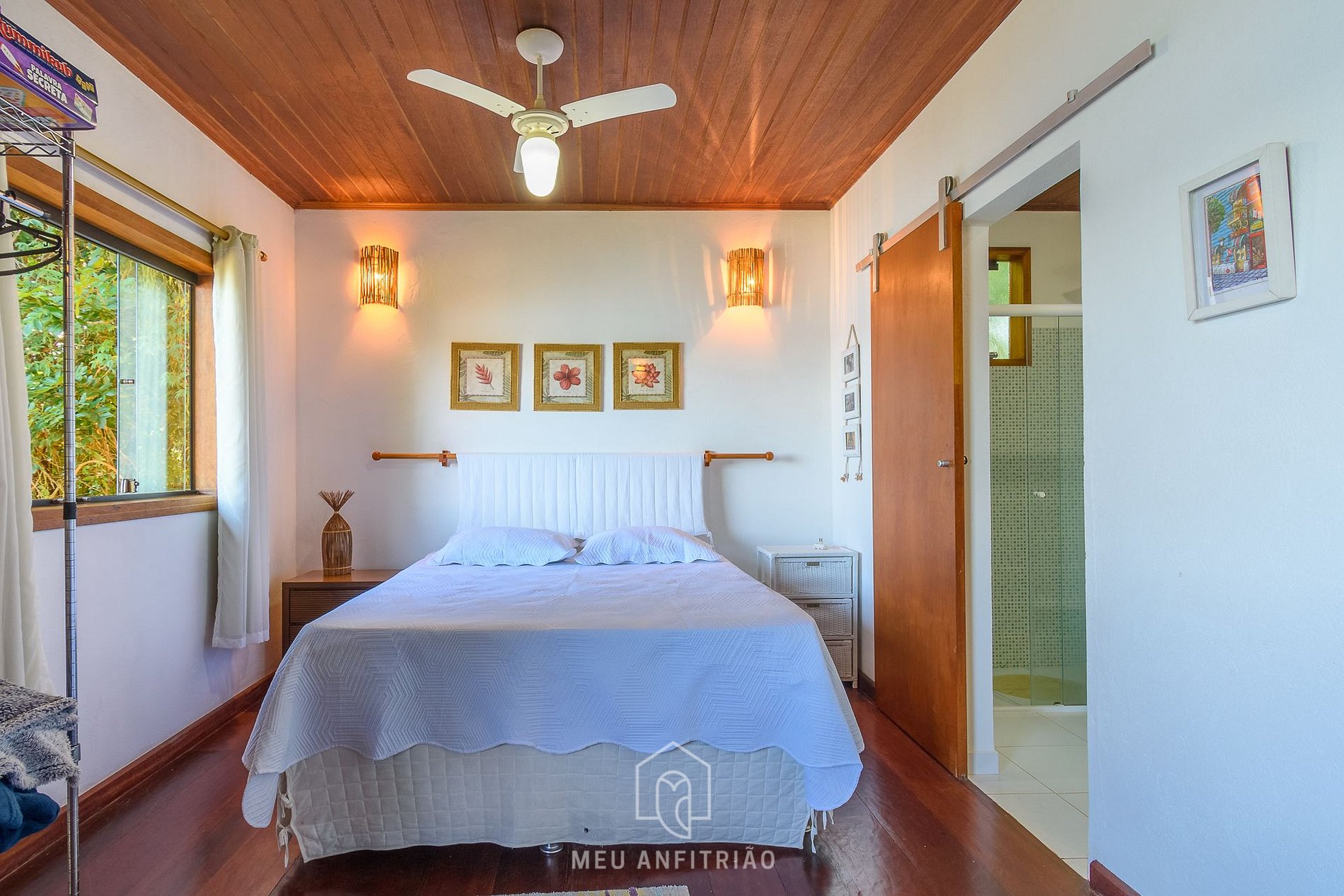 Ao entrar na casa, o hóspede terá acesso à sala de estar com sofá e à cozinha, que possui os utensílios necessários para uma estadia prática, como micro-ondas, geladeira, fogão, forno, cooler entre outros. Em seguida, temos a varanda, que conta com mesas e cadeiras para refeições enquanto é possível contemplar a vista para o mar. Temos duas suítes no andar térreo, sendo que uma possui duas camas de solteiro e a outra possui uma cama queen. A suíte master está no segundo andar, e possui uma cama de casal e duas camas de solteiro.