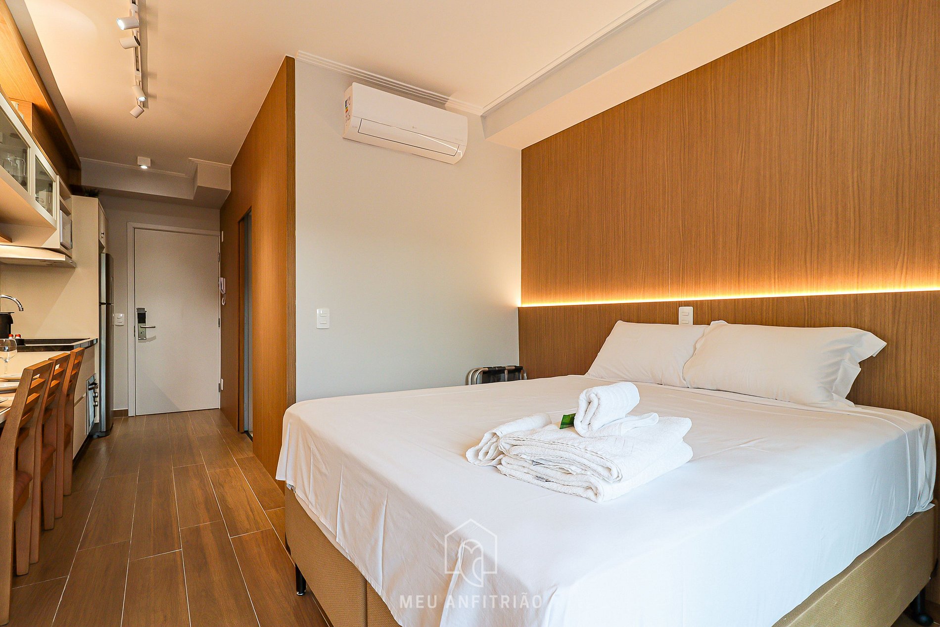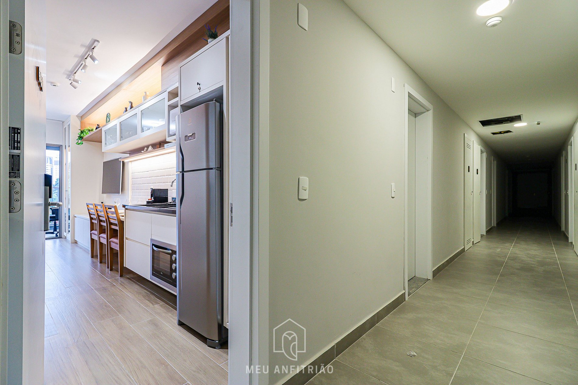 Ao entrar, o hóspede estará na cozinha, que conta com água aquecida na torneira da pia e com os utensílios necessários para uma estadia prática, como fogão cooktop, geladeira, micro-ondas, purificador de água Electrolux com água gelada e natural, coifa, forno elétrico, mixer, cafeteira Nespresso, sanduicheira entre outros. A varanda conta com vista para a cidade, cortinas blackout e fechamento de vidro, além de uma mesa com cadeira para home office.