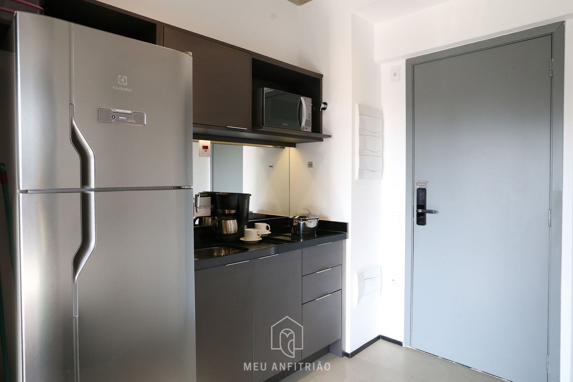 Entrando no studio, o hóspede terá acesso à cozinha, que dispõe dos utensílios necessários para a hospedagem, como fogão cooktop, geladeira, micro-ondas, sanduicheira, liquidificador, cafeteira e chaleira elétricas, entre outros.