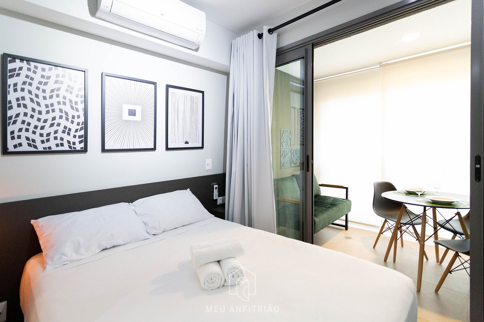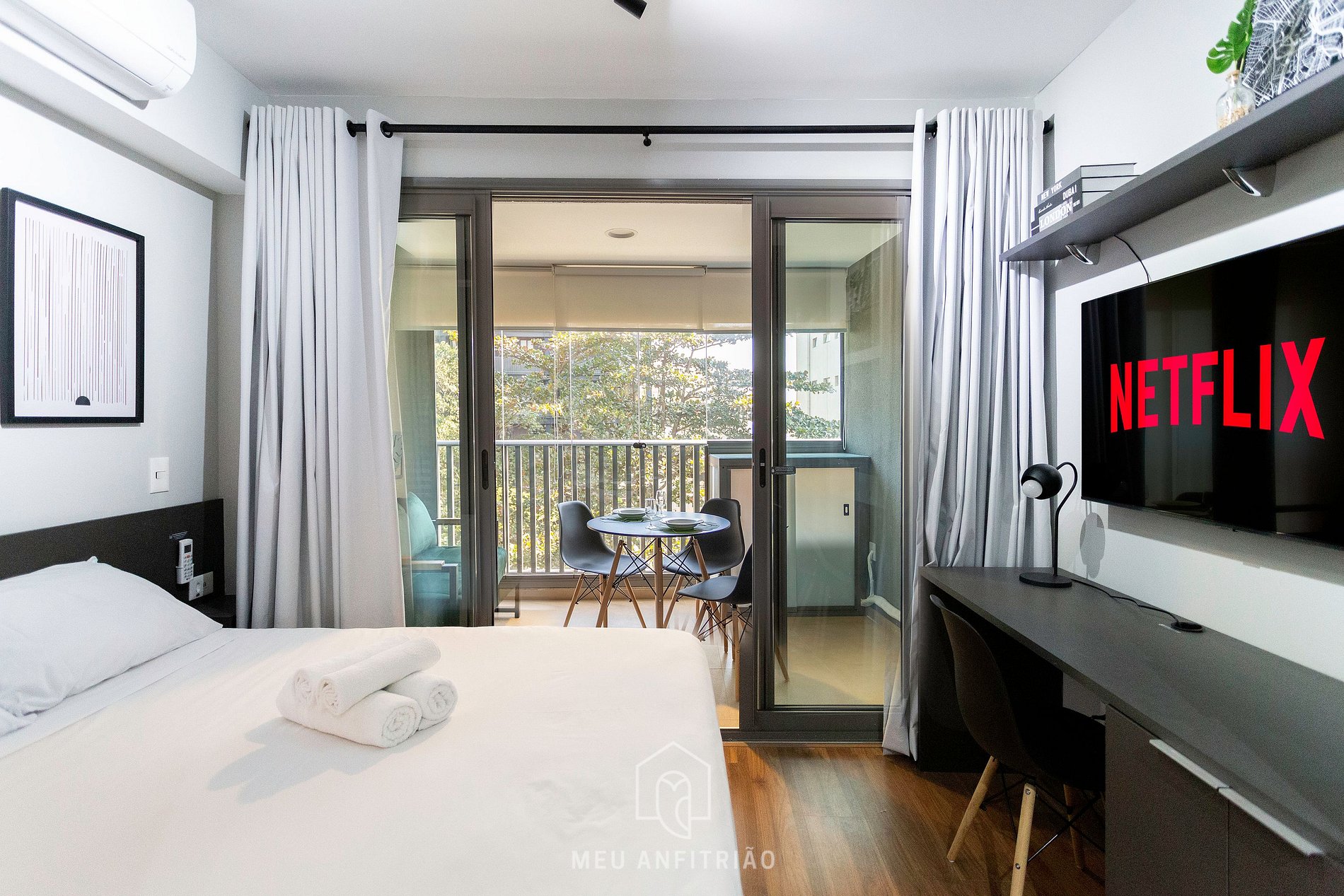 O studio é em conceito aberto e acomoda até 2 pessoas em cama de casal. No mesmo ambiente dispomos de uma cozinha com utensílios necessários para a estadia, banheiro, armário, escrivaninha para home office e TV Smart.