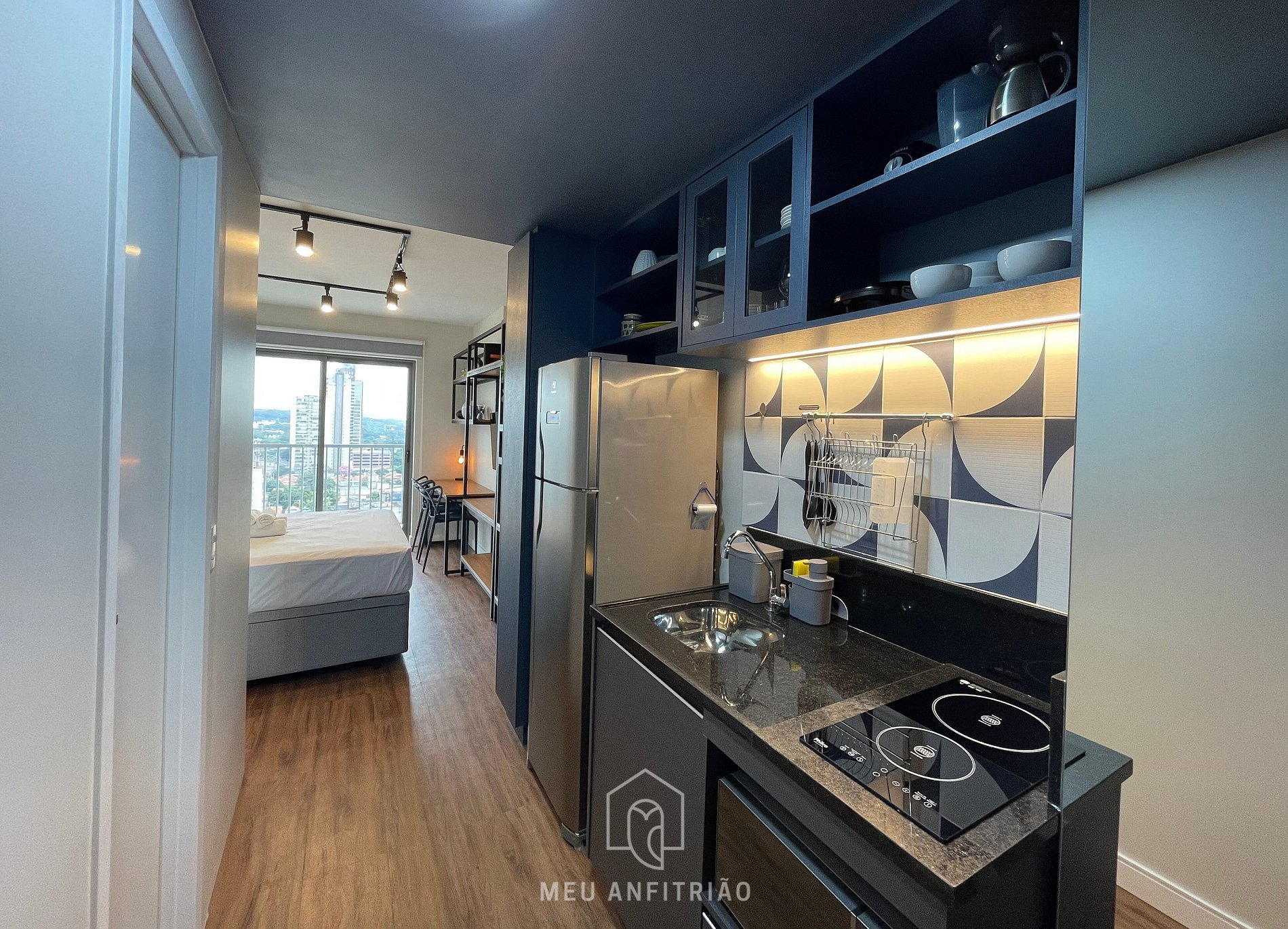 Studio bem montado e bem localizado com boa infraestrutura como academia, piscina e coworking, perto do mercado e barzinhos.