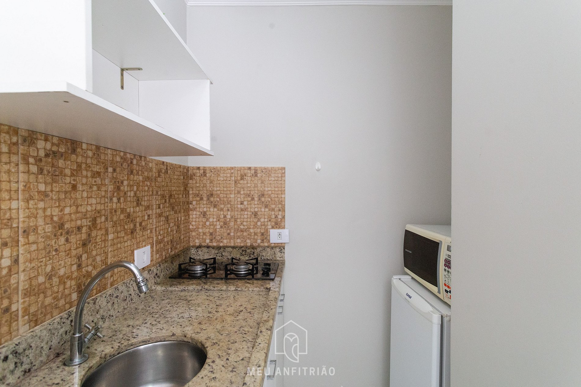 A cozinha é equipada com os utensílios para uma estadia prática, como talheres, copos, pratos, panelas e xicaras, além de contar com fogão cooktop, geladeira/frigobar, micro-ondas.