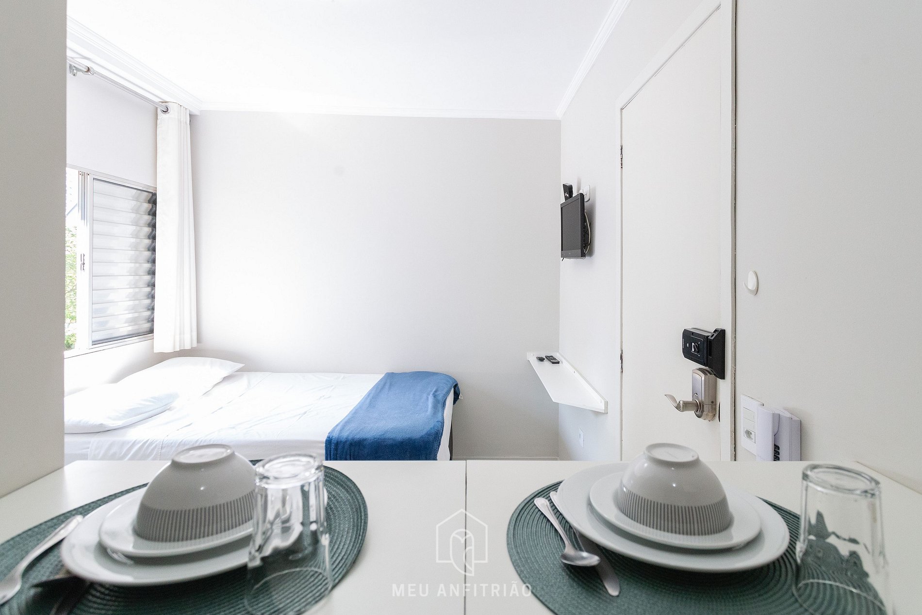 Também disponibilizamos TV Smart, mesa com cadeiras para refeições ou home office, cortinas, além de um banheiro com chuveiro a gás.